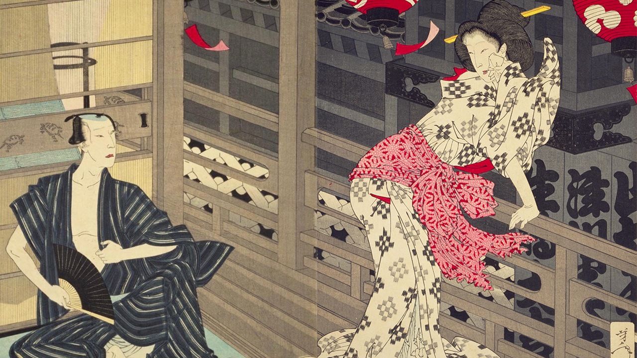 L’estampe intitulée « Nouvelle sélection d’estampes nishiki-e de l’Est : L’affaire Ikushima Shingorô » (Shinsen azuma nishiki-e Ikushima Shingorô no hanashi, 1886) que l’on peut voir en bannière de l’article, est de la main de Tsukioka Yoshitoshi (1839-92). Sur la gauche, on voit l’acteur de kabuki Ikushima Shingorô. De prime abord, on pourrait croire qu’Ejima (1681-1741), la protagoniste de l’affaire représentée à droite de l’image, est une courtisane. On dirait qu’elle est en train de minauder, mais cette femme talentueuse avait gravi un à un les échelons pour devenir une figure influente de l’ôoku, le gynécée. Il s’agit des chambres intérieures du château d’Edo réservées aux femmes affectées au service des shôguns qui se sont succédé à l’époque d’Edo (1603-1868).