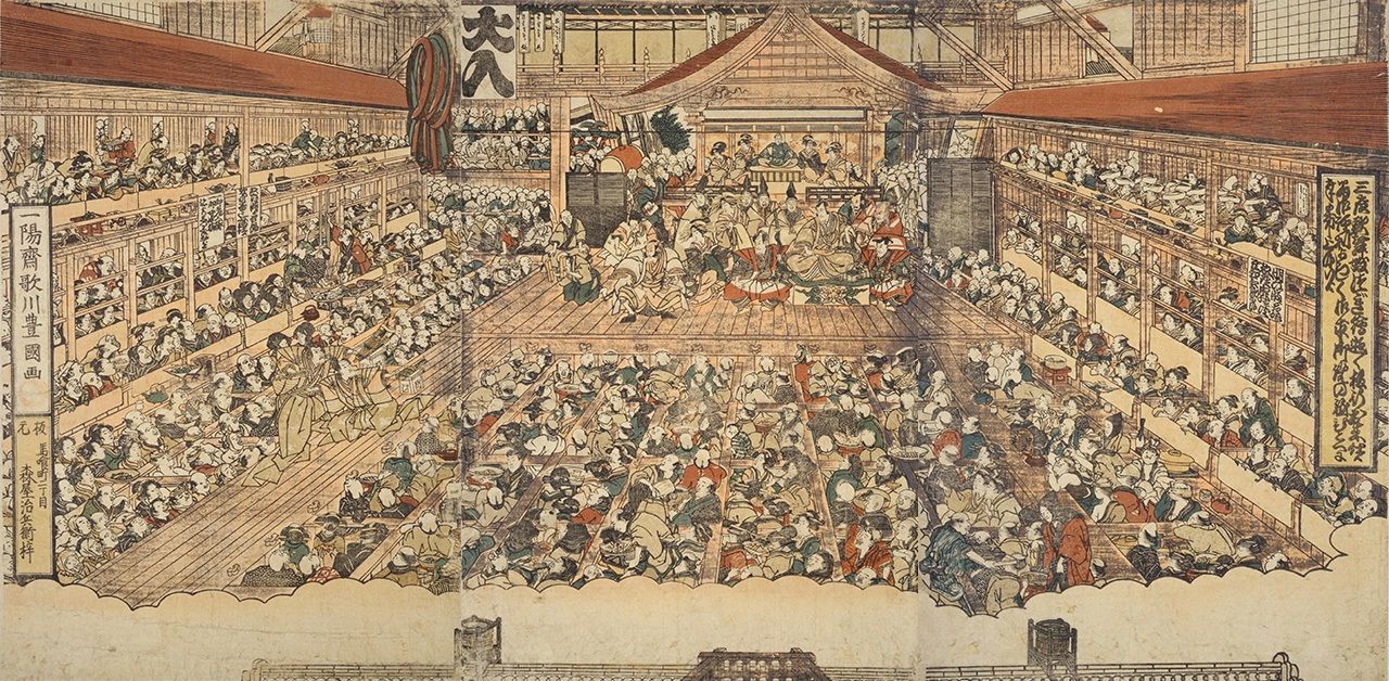 Sur cette estampe, on voit l’effervescence du Nakamura-za, un théâtre de kabuki en vogue à l’époque d’Edo. Cette scène nous permet d’imaginer l’ambiance du Yamamura-za (dirigé par Yamamura Chôdayû), où Ejima aurait vu jouer Shingorô. (« Vues diverses du Nakamura-za , Nakamura-za naigai no zu, collections de la Bibliothèque nationale du Japon)