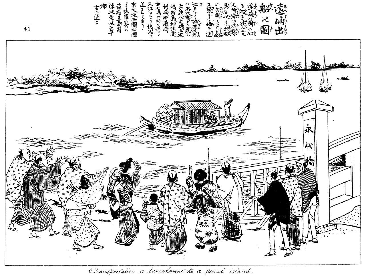 Les badauds regardent s’éloigner le bateau emmenant les condamnés à l’exil. Partie du pont Eitai sur la Sumida et l’embarcation mettra le cap sur Ôshima, puis fera route vers Hachi-jô, Miyake et Niijima. Shingorô l’exilé vivra à Miyake jusqu’à sa grâce qu’il obtiendra en 1742. (Gravure tirée des « Chroniques criminelles illustrées du bakufu Tokugawa », Tokugawa Bakufu Keiji Zufu, collections de la Bibliothèque nationale du Japon)