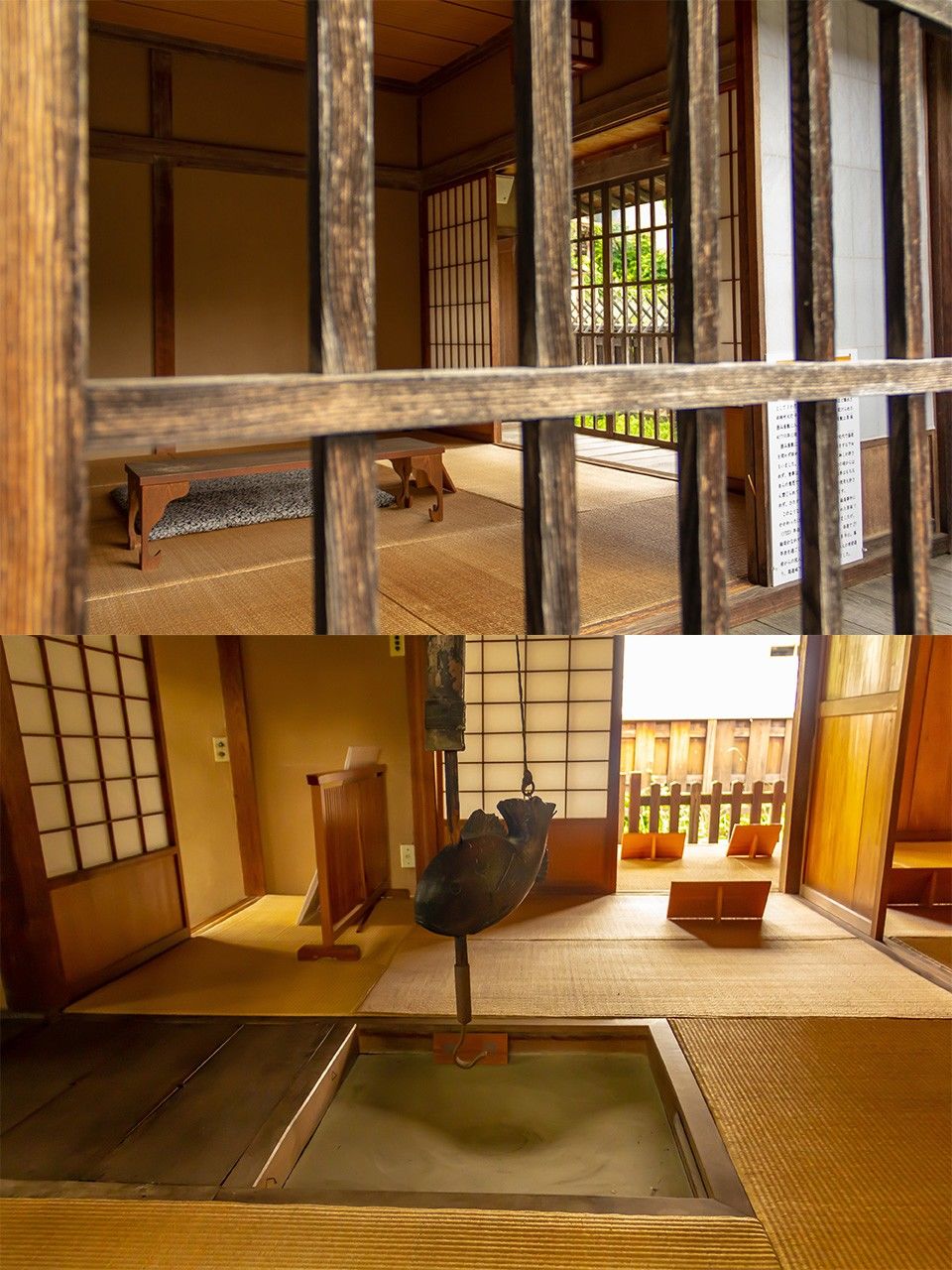 Reconstitution de la pièce où vécut Ejima lors de sa résidence surveillée, sa baie fermée de barreaux (en haut) et vue de l’intérieur (en bas). La pièce fait environ 8 tatamis, elle y a vécu de longues années sans jamais en sortir pour la moindre promenade et avec quelques servantes pour seules interlocutrices. (Pixta)