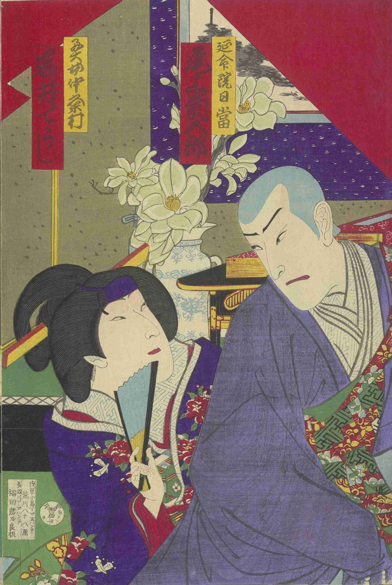 Sur cette estampe peinte par Toyohara Kunichika en 1878, on peut voir les protagonistes de la pièce de kabuki intitulée « Histoire de lune et d’étoiles à l’époque Kyôwa (1801-04) » (Nichigetsusei kyôwa seidan, 1878). Kikugorô Onoe V (à droite) incarne Nichidô qui dans la pièce est rebaptisé « Nittô ». Le personnage de Kumemura (à gauche) est interprété par Iwai Teuji. (Salle des collections spéciales de la bibliothèque centrale de Tokyo)