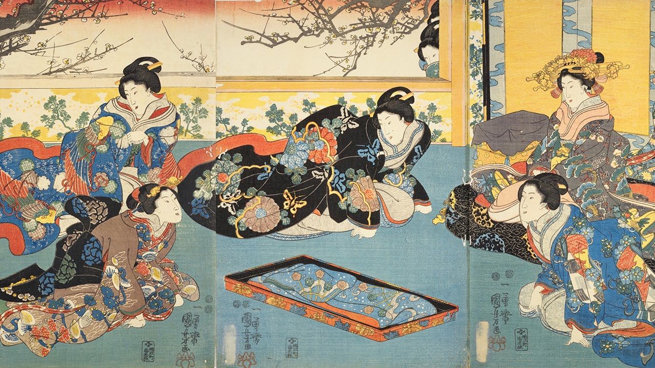 (Photo de titre : sur l’estampe intitulée « Jeunes femmes passant l’entretien pour devenir favorite » (Musume Omemie-zu), on voit à droite une favorite accompagnée de sa servante, elle est assise et semble soumettre le kimono qu’elle a cousu en attendant l’évaluation de l’épouse légitime du shôgun. Collections de la Bibliothèque nationale du Japon)