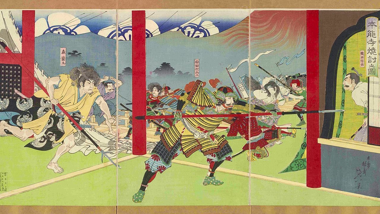 (Photo de titre : « L’incendie du Honnô-ji ». À droite, on distingue Nobunaga caché derrière un store de bambou. Collections spéciales de la bibliothèque centrale de Tokyo.)