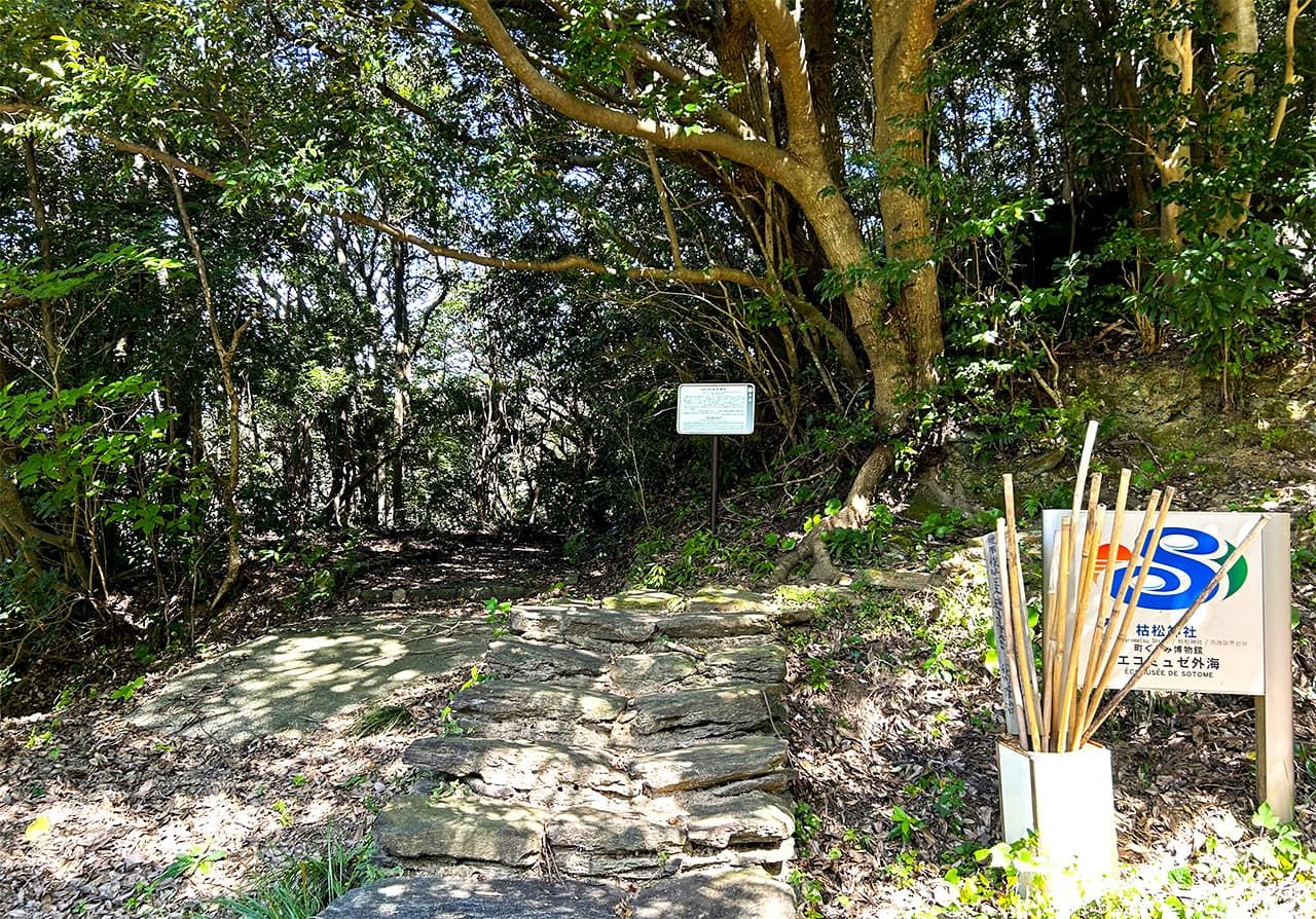 Entrée du sanctuaire de Karematsu. De là, cinq minutes de marche supplémentaires sur un chemin empierré mènent au pavillon principal. Des bâtons de marche sont mis à la disposition des fidèles devant le panneau d’information.