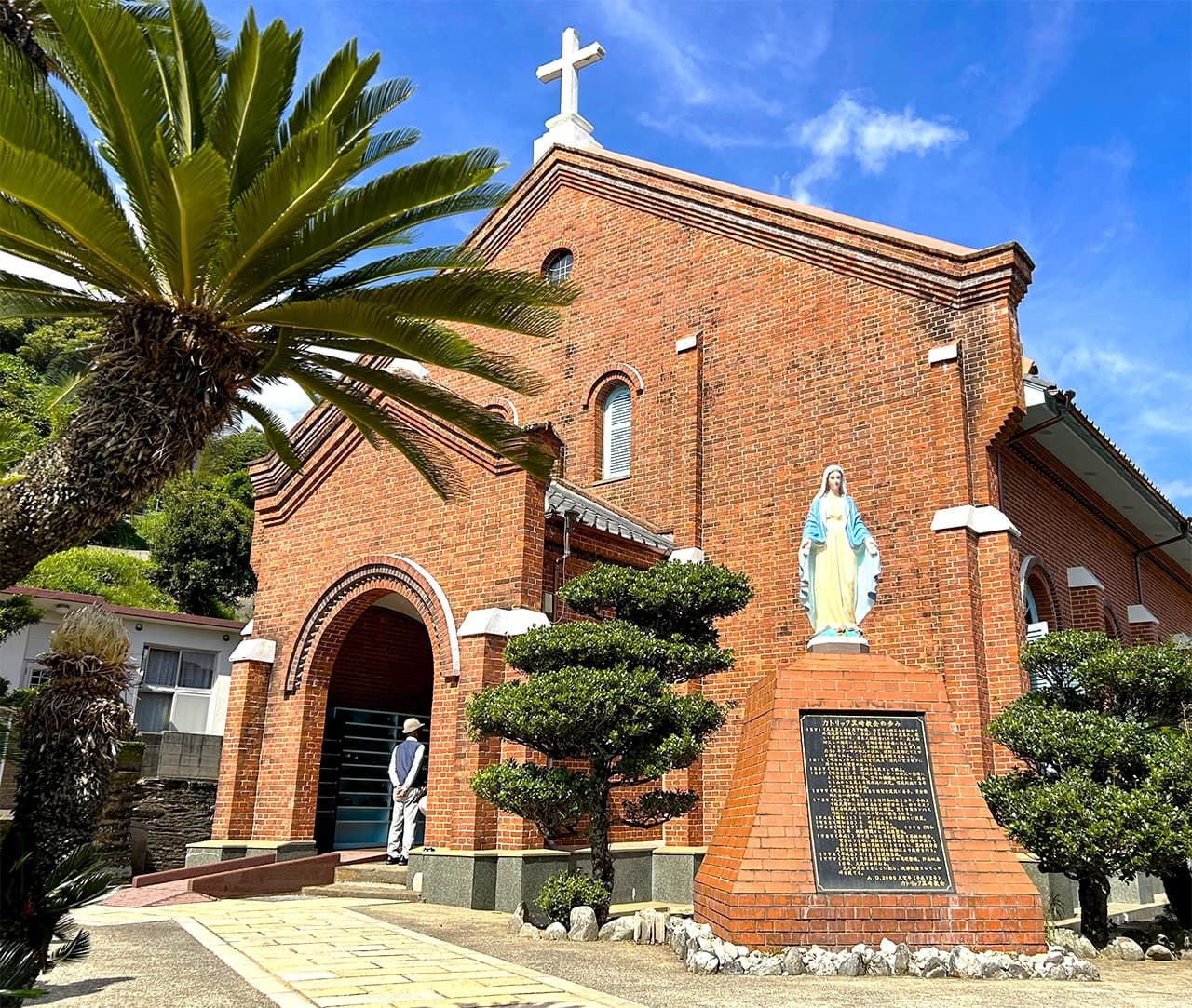 L’église de Kurosaki, en briques, avec une impressionnante statue de la Vierge Marie debout, les bras écartés, achevée en 1920, à quelques pas de l’arrêt de bus « Église de Kurosaki » (Kurosaki-kyôkai-mae) .