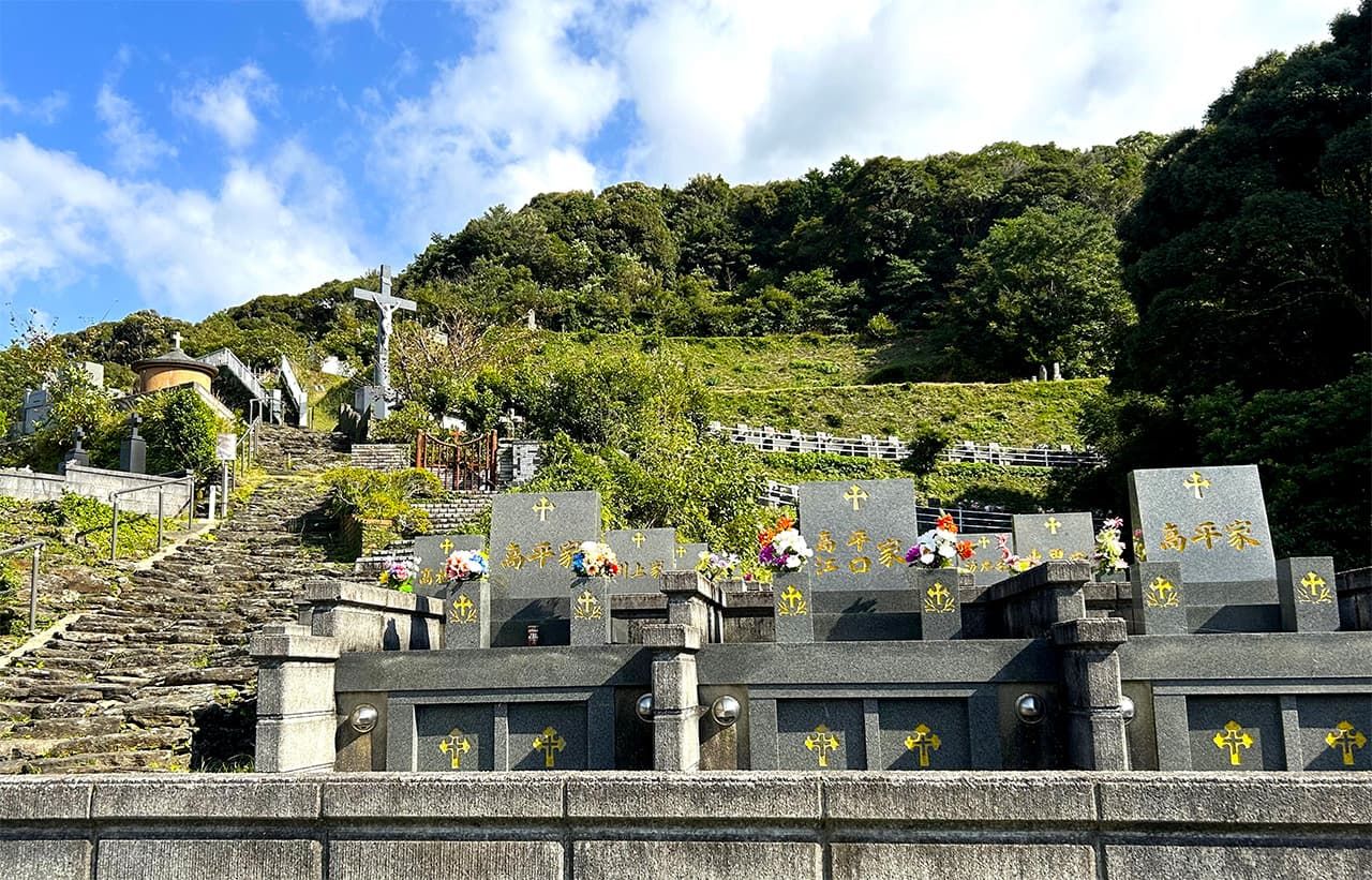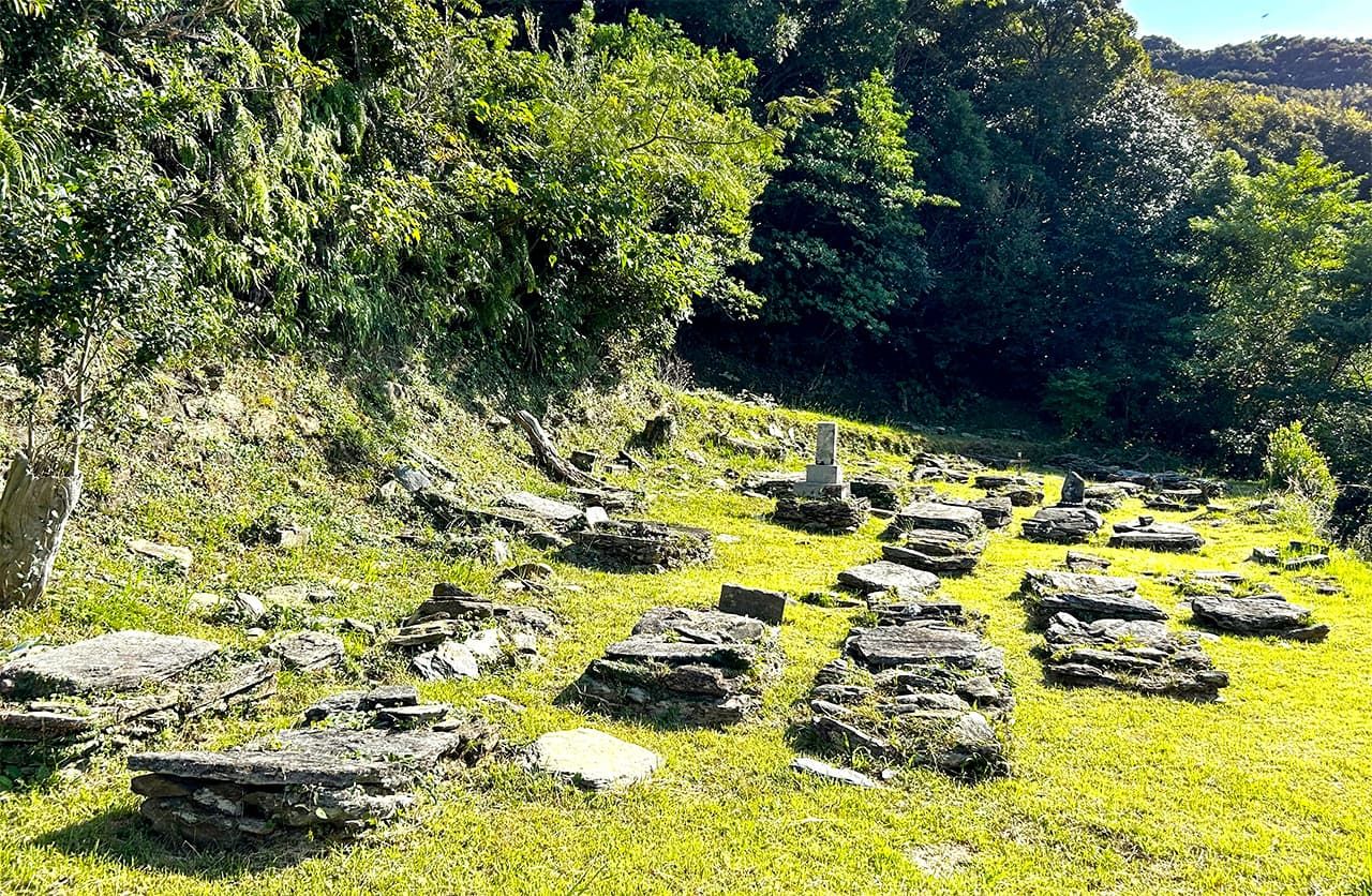 En haut des longues et raides marches de pierre du cimetière communal se trouvent des rangées de tombes dont la maçonnerie en pierre est unique à la région de Sotome.