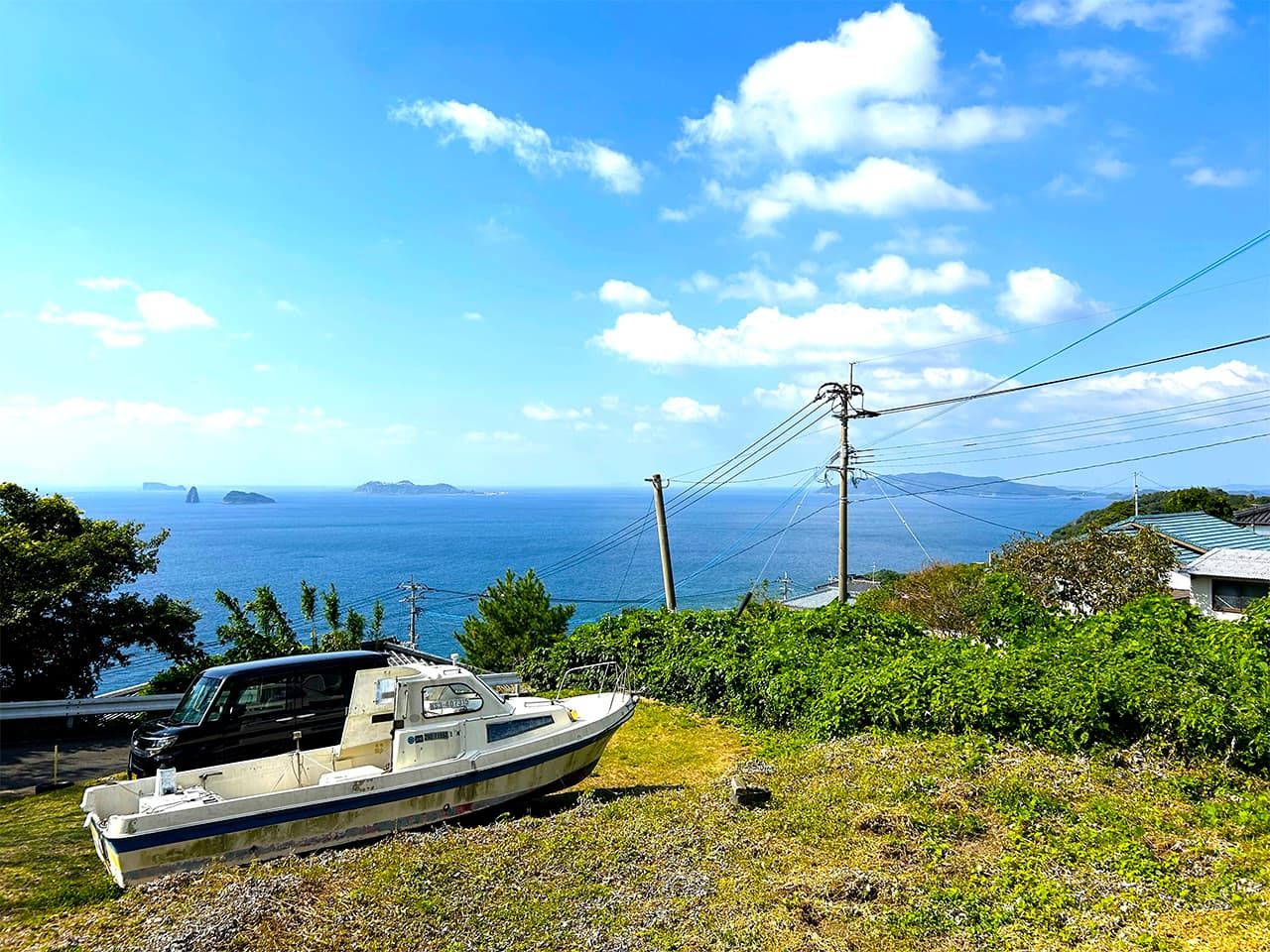 Vue des hauteurs de l’église de Kurosaki vers le sanctuaire de Karematsu. Un bateau de pêche abandonné dans un jardin privé.