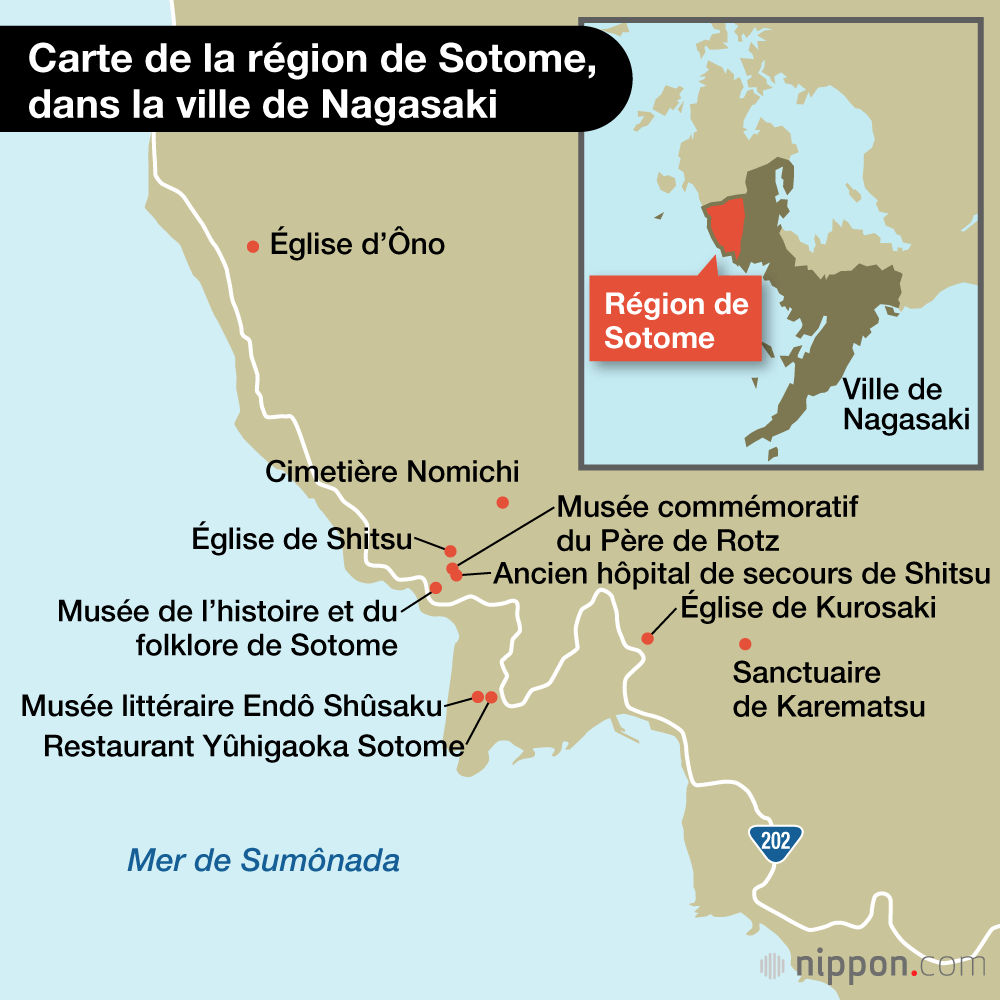 Cinq années se sont écoulées depuis son inscription au patrimoine mondial, mais contrairement à des lieux comme l’église de Ôura, au centre de Nagasaki, qui est visitée de nombreux touristes, y compris étrangers, la région de Sotome est calme. On espère qu’un plus grand nombre de personnes visiteront la région, mais pour cela, il est essentiel d’améliorer l’accessibilité. Chaque village est situé le long d’une ligne de bus et les sites historiques sont proches les uns des autres, mais il n’y a qu’un seul bus par heure. Une navette ou un service de bus communautaire serait plus pratique.
