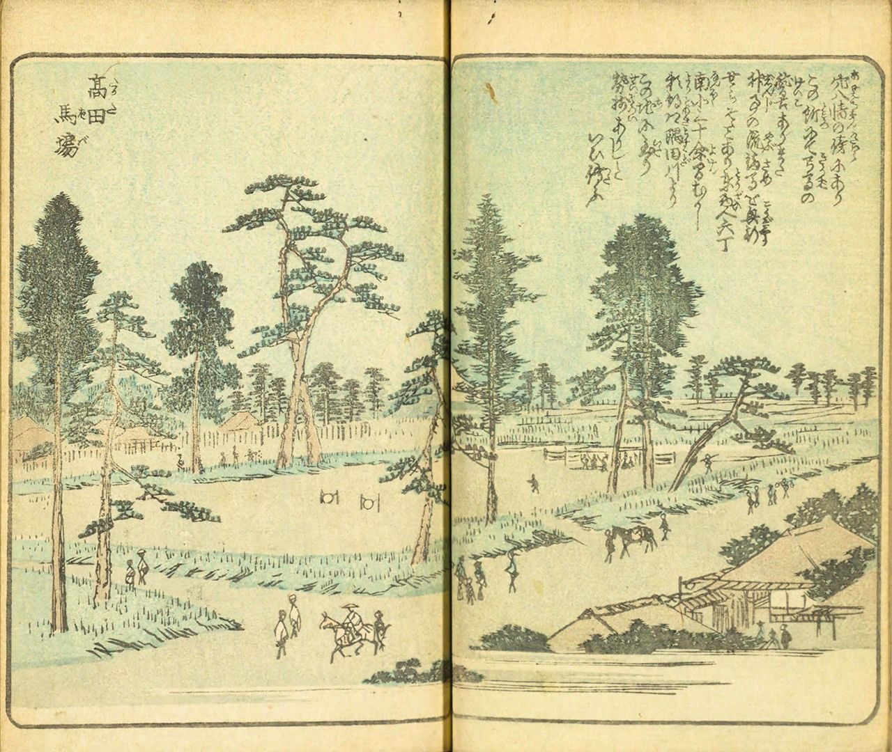 Takadanobaba en temps ordinaire, tel qu’il apparaît dans le « Livre illustré des souvenirs d’Edo » (Ehon Edo Miyage). On y distingue un paisible paysage rural, avec ce qui semble être une maison de thé dans l’angle inférieur droit. (Collection de la Bibliothèque nationale de la Diète)