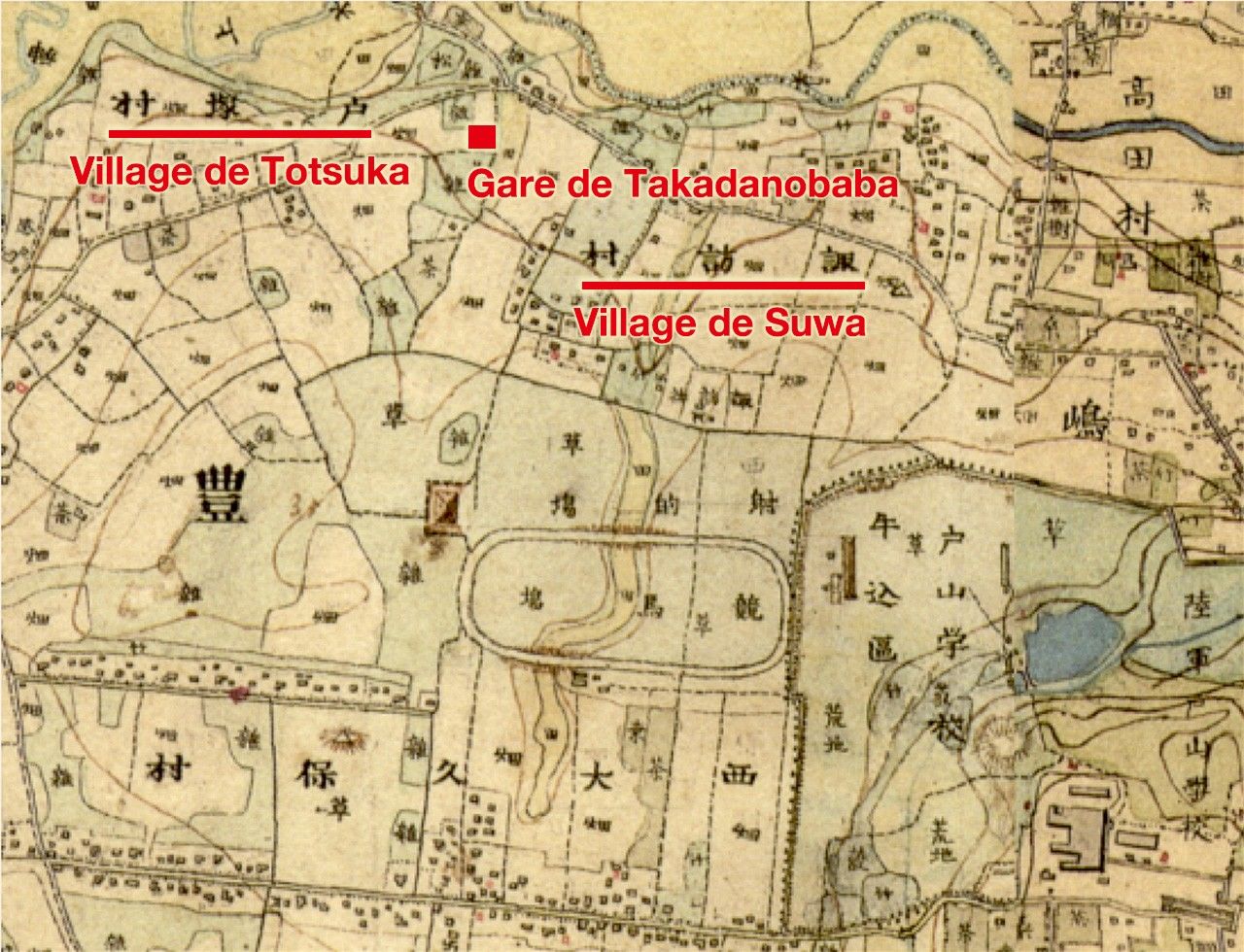 Carte des environs de la gare de Takadanobaba à l’époque de Meiji. Les lieux situés à proximité de la gare portaient alors les noms de « village de Totsuka » et « village de Suwa ». Reproduction tirée du Système de consultation des environnements agricoles historiques de l’Organisation nationale de recherche en agriculture et alimentation.