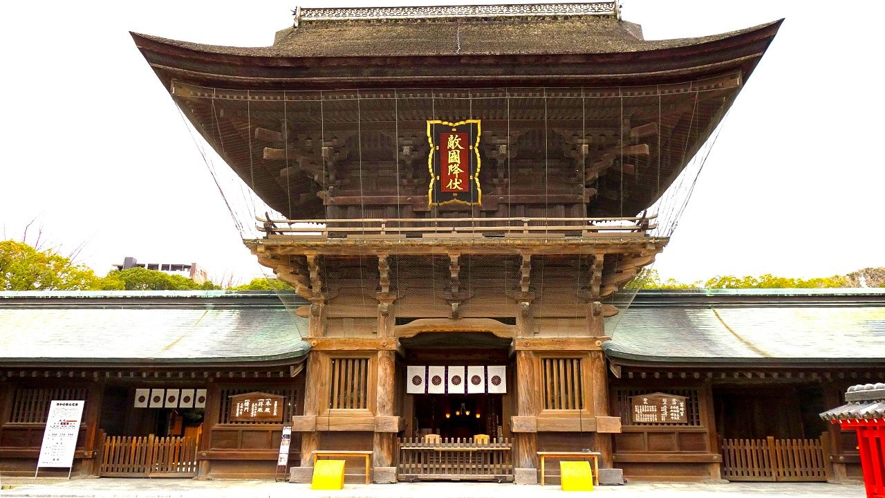 Une immense plaque portant l’inscription Tekikoku kôfuku est suspendue au rômon du sanctuaire Hakozaki. (© Nippon.com)