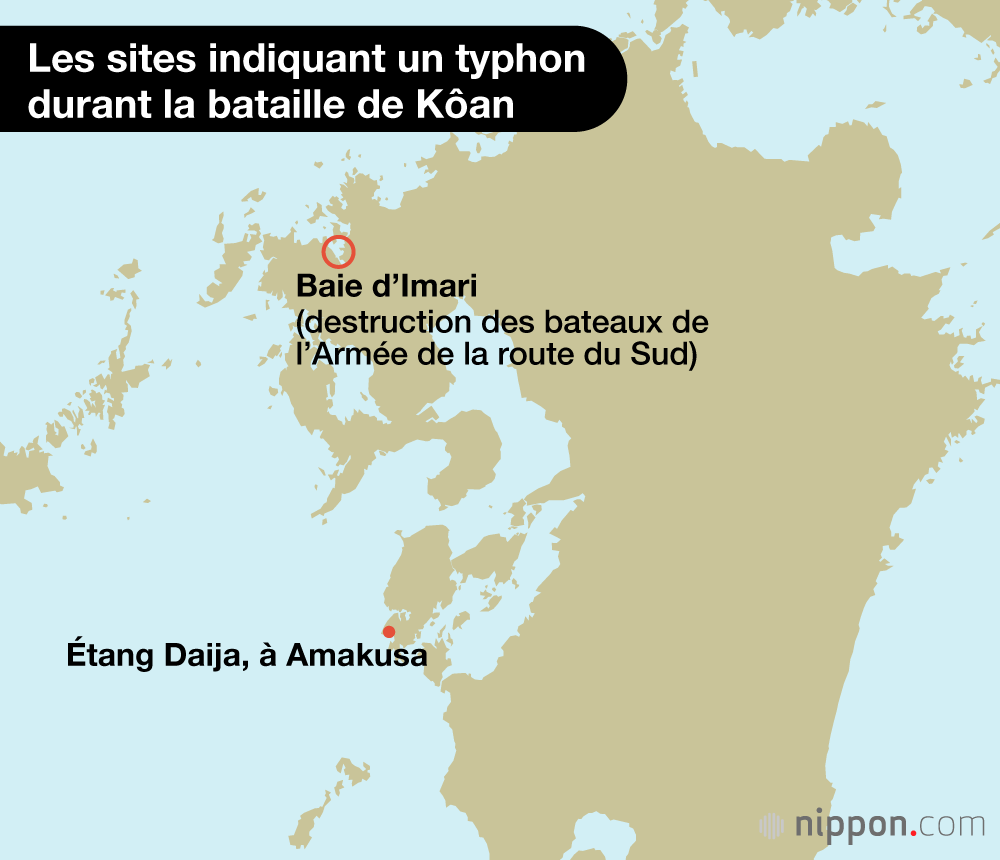 La datation au carbone 14 a révélé que la plupart de ces couches remontaient à des périodes très anciennes. Cependant, une bande de 63 centimètres située à 1,28 mètre de profondeur daterait du XIIIe siècle. En étudiant cette strate, Haraguchi estime que, bien qu’un tsunami ne puisse être totalement exclu, les caractéristiques du dépôt sont davantage compatibles avec celles d’un typhon intense du type de ceux qui frappaient fréquemment cette région. « Il est tout à fait possible que nous soyons en présence d’une trace de la tempête qui a sévi lors de la bataille de Kôan en 1281. »