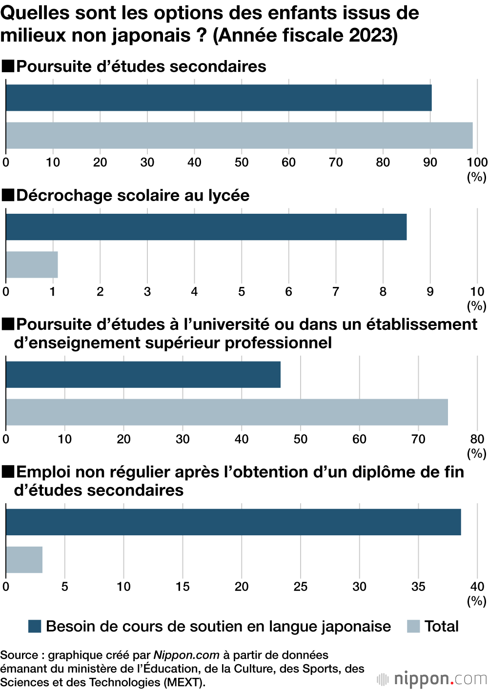 Le niveau de connaissance en japonais a également un impact sur la future carrière de ces élèves après le lycée. Lors de l’année fiscale 2023, seulement 46,6 % des lycéens ayant besoin de cours de soutien en japonais ont pu intégrer une université ou une école technique, soit 30 points de moins que la moyenne pour tous les autres élèves.