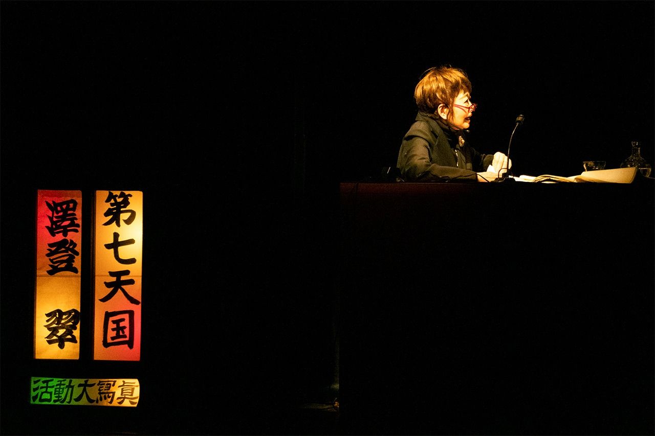 Sawato est assise à son pupitre, côté jardin. Quand le noir se fait, la projection commence et sa voix résonne dans toute la salle.