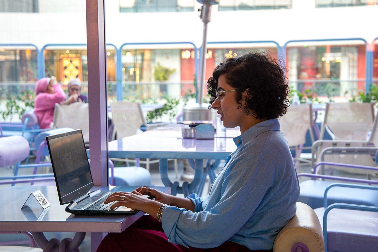 Rana Seif attelée à son ordinateur dans un café, au Caire.