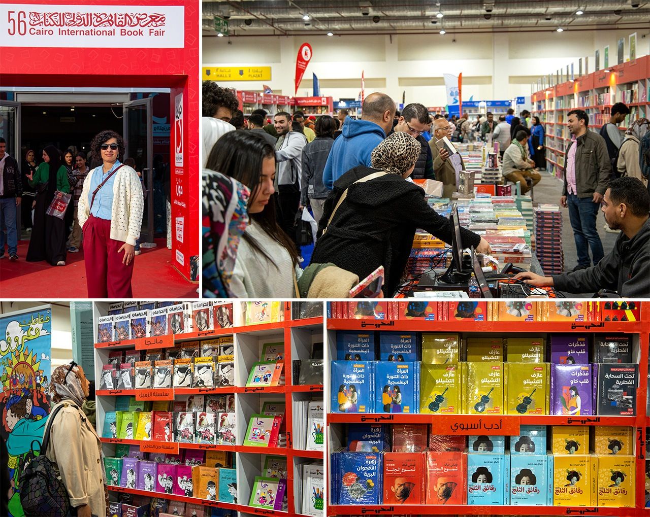 Dans le sens des aiguilles d’une montre à partir du haut à gauche : Rana Seif à l’entrée du Salon international du livre du Caire ; au salon, une foule de passionnés à l’intérieur ; œuvres telles que Journal d’un vide et La femme à la jupe violette alignées sur des étagères ; une femme regardant des traductions de manga, notamment celles de Rana Seif.