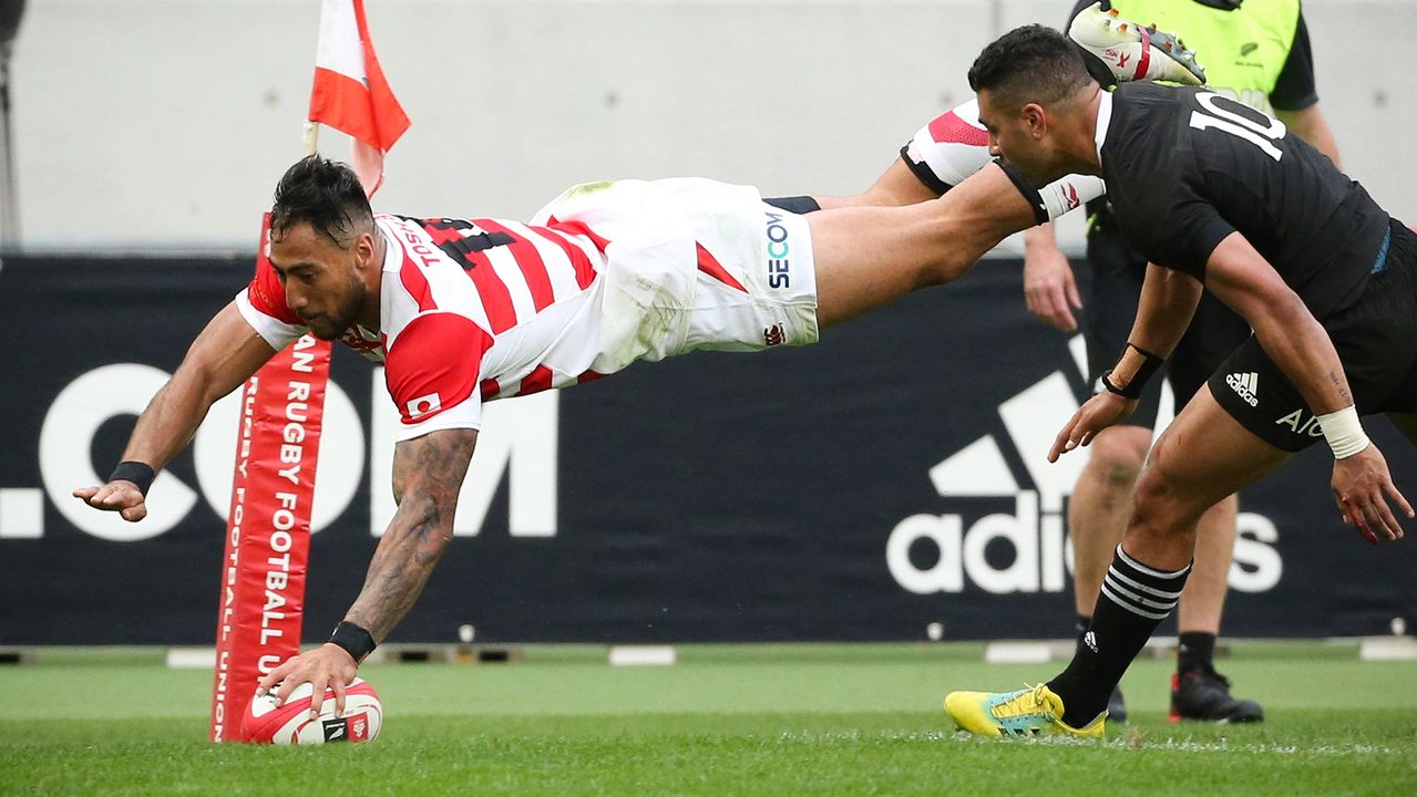 (Photo de titre : Jamie Henry marque un essai pour le Japon à la seconde mi-temps du match amical du 3 novembre 2018 contre la Nouvelle-Zélande. Jiji Press)