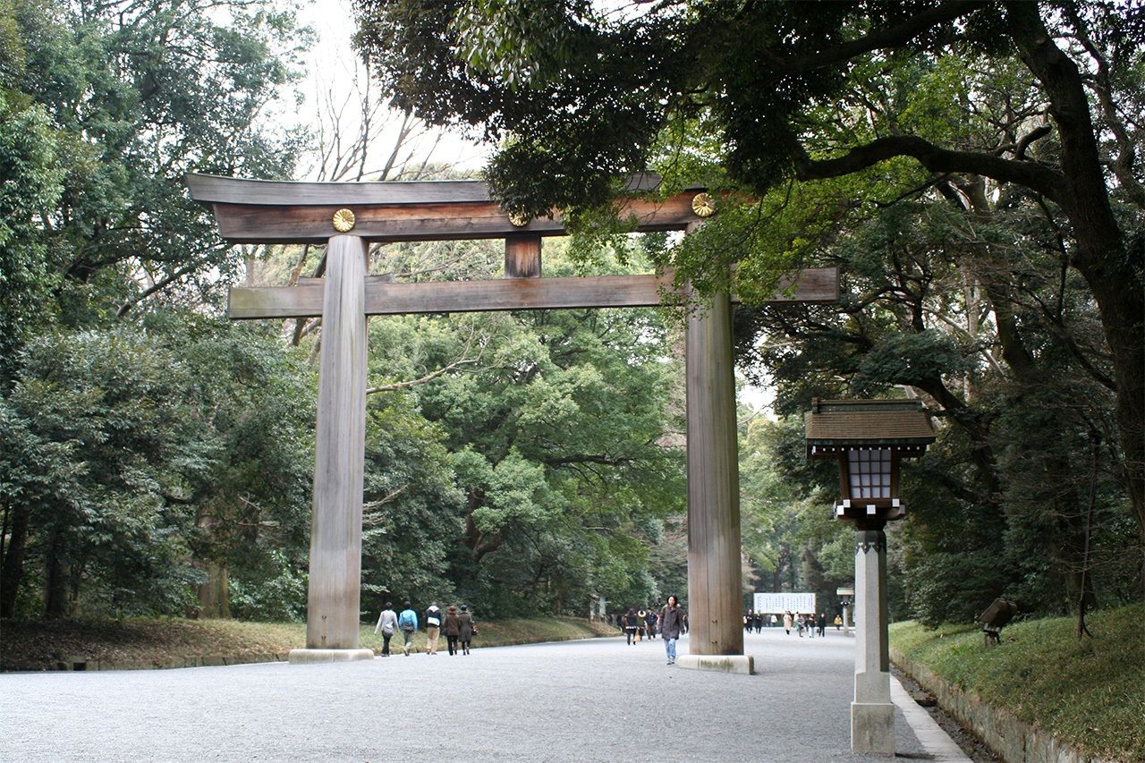 Dédié non pas à un kami de la nature mais à un empereur déifié, le sanctuaire Meiji n’en possède pas moins une impressionnante « forêt sacrée » (chinju no mori), qui surplombe le jardin intérieur où se trouve le bâtiment principal, et offre un oasis de calme au sein de la trépidante métropole. Les visiteurs qui marchent sous la vaste canopée pourraient être tentés de croire qu’ils se promènent dans une forêt vierge, mais les bois sont le fruit d’une soigneuse planification et les arbres ont été plantés à la main il y a à peine quelques générations. Le jardin extérieur du sanctuaire, situé à plusieurs pâtés de maisons de là, abrite des installations culturelles telles que la Galerie de peintures commémorative de Meiji et des terrains de sport, mais on y trouve aussi de vastes étendues boisées.