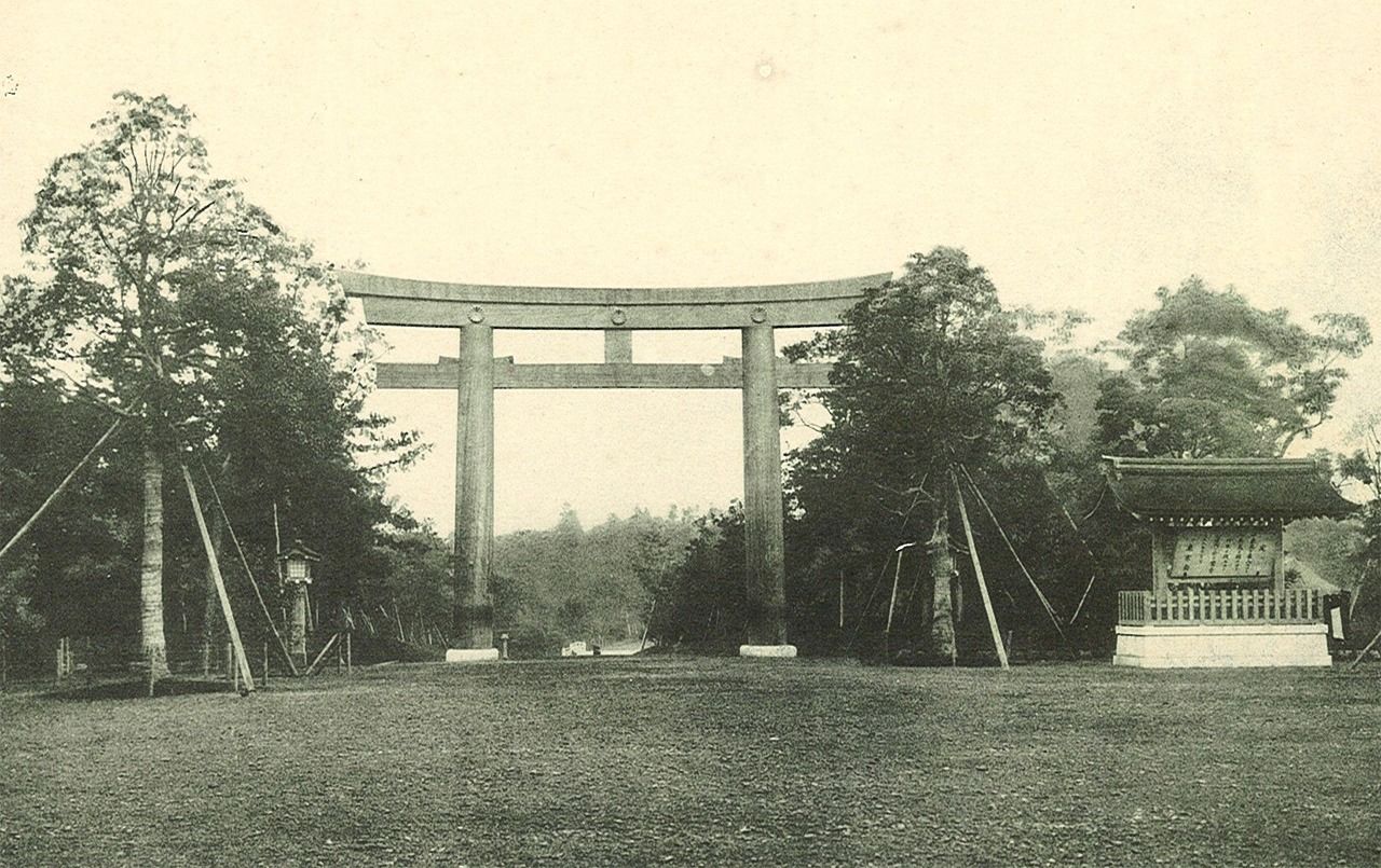 Le torii géant de l’entrée sud, proche d’Omotesandô, pendant la construction du sanctuaire.