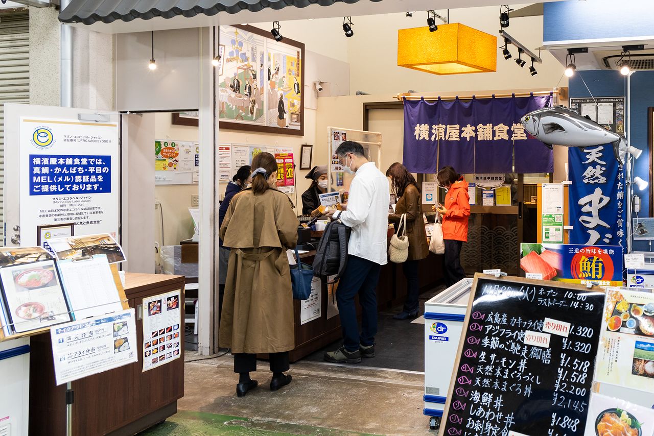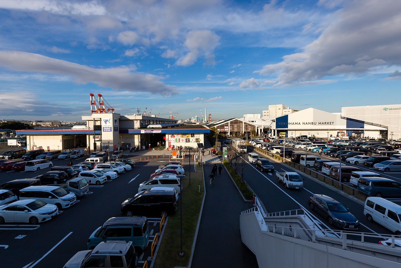 Le marché Nanbu, à Yokohama, comprend à la fois des grossistes et des détaillants vendant des produits marins, des fruits et des légumes, ainsi que des fleurs. Le bâtiment à gauche comprend une variété de restaurants, dont le Yokohama-ya Honpo Dining, l’établissement opéré par le grossiste Yokoshoku.