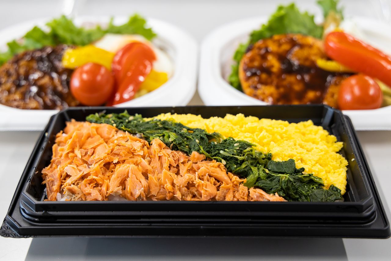 Un des autres bentô à base de saumon est particulièrement coloré avec ses stries rose, vert et jaune. Les garnitures de saumon aigre-doux effiloché, d’épinards et d’œufs brouillés recouvrent du riz blanc. Les jeunes concepteurs de ce repas ont souhaité créer un « apparence attractive pour la génération Instagram », en ayant la conviction que l’apparition du produit sur les réseaux sociaux permettrait de promouvoir la prise de conscience autour des ODD. « Nous n’aurions jamais pensé à cela, ni au bentô locomoco », déclare Seto avec admiration. « Ces jeunes gens savent vraiment comment rendre ces plats plus attrayants. »