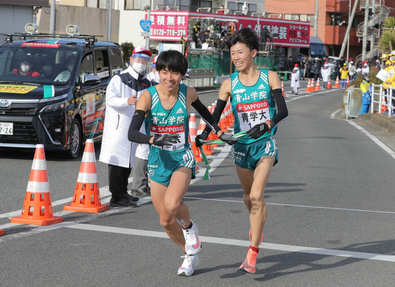 Kondô Kôtarô, de l’université Aoyama Gakuin, à droite, termine la septième étape du Hakone Ekiden 2021, remettant le tasuki à son coéquipier Iwami Shûya, coureur de la huitième étape. L’équipe avait terminé à la quatrième place cette fois-ci, mais elle a été redoutable ces dernières années, remportant six des huit courses effectuées depuis 2015. La photo a été prise au point de relais situé à Hiratsuka, dans la préfecture de Kanagawa, le 3 janvier 2021. (Jiji)