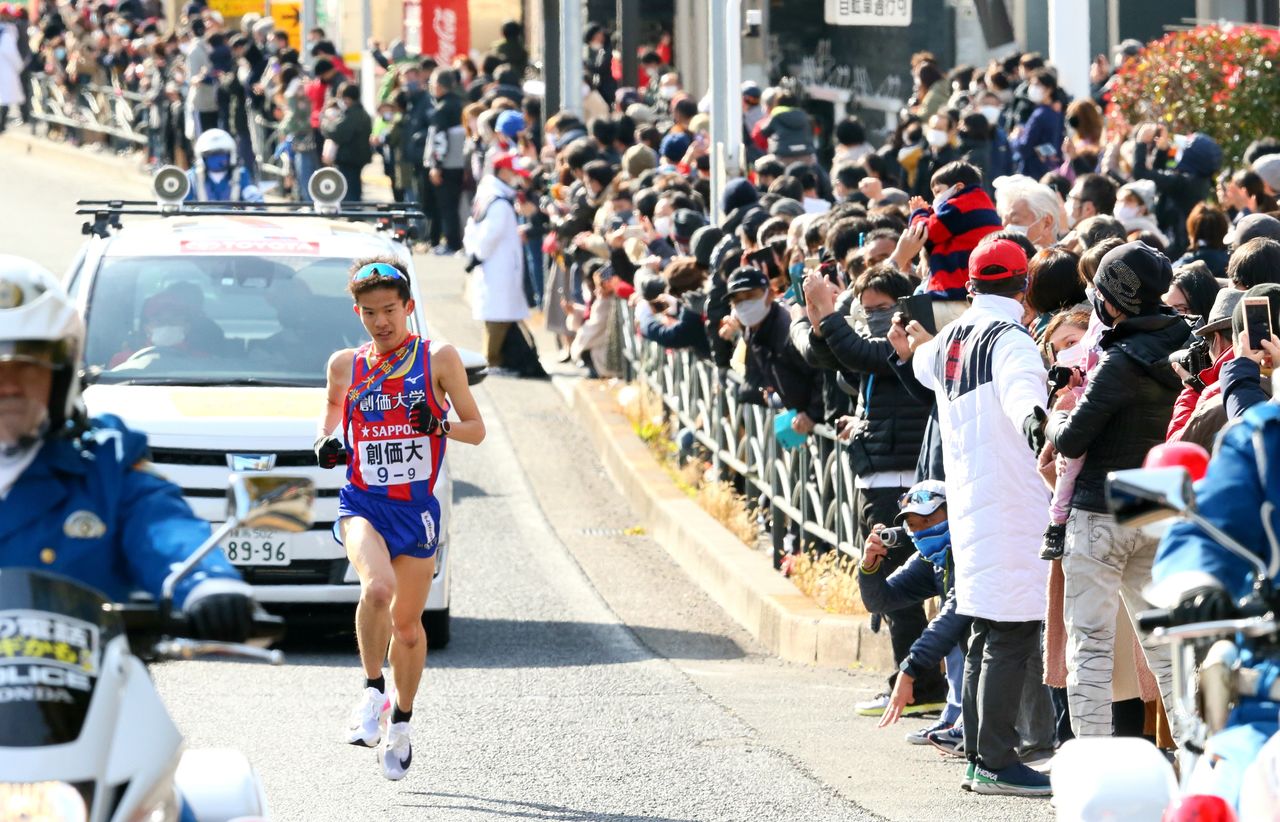 Ishizu Yoshiaki réalise une solide performance lors de la neuvième étape du Hakone Ekiden en 2021. Son équipe, celle de l’université Sôka, a fini à la deuxième place du classement général. La photo a été prise le 3 janvier à Yokohama. (Jiji)
