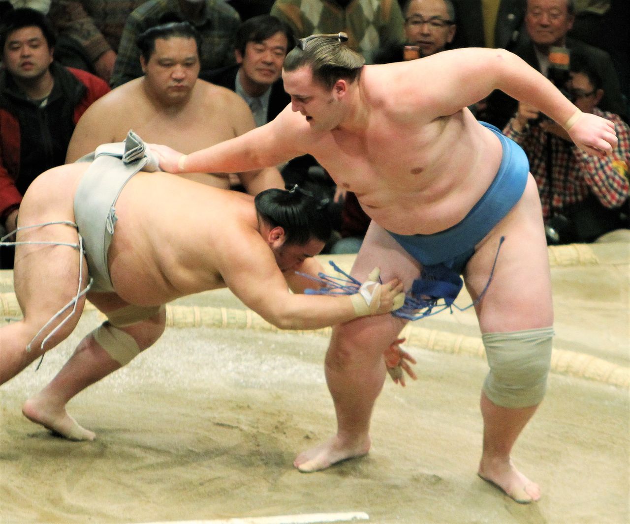 Au tournoi de juillet 2009, Asashôryû (à gauche), d’origine mongole, soulevant Harumafuji sur sa jambe et exécutant un yaguranage en le projetant à sa gauche. Interviewé après le match, Asashôryû a déclaré que la technique était aussi utilisée dans la lutte mongole et qu’il prévoyait depuis un certain temps de l’utiliser. (Jiji Press)