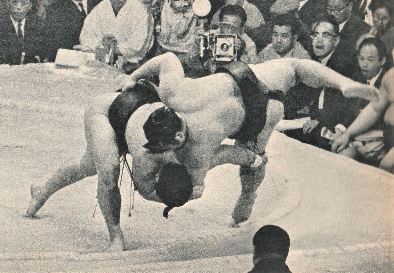 Le dixième jour du tournoi de novembre 1968, Futagodake (à gauche) remporte la victoire contre Uminoyama grâce à un sotomusô. Futagodake maîtrisait également la variante uchimusô. (Avec l’aimable autorisation du journal Ôzumô)