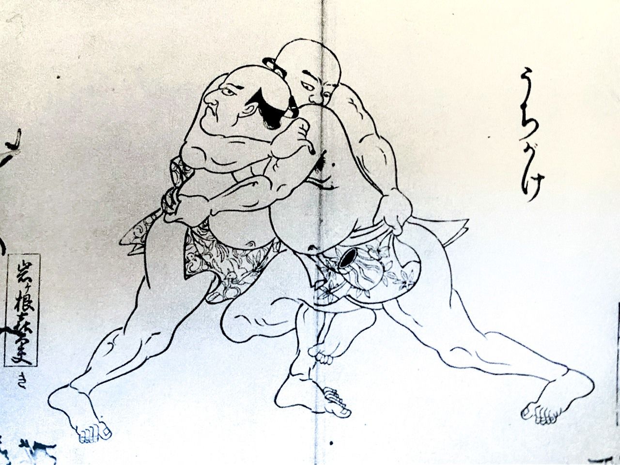 Illustration d’un uchigake (crochetage intérieur de la jambe), un des 48 kimarite, dans un ouvrage datant de l’époque d’Edo sur le sumo. (Avec l’aimable autorisation du journal Ôzumô)