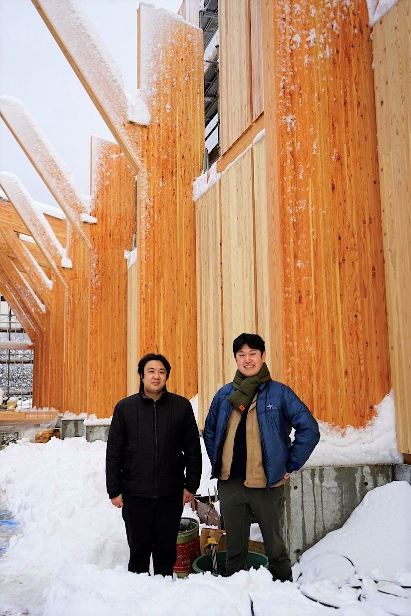 Inagaki Takahiko (droite) et Shimono Tadaaki (gauche) devant le chai en travaux. Tous les deux sont convaincus que toute l’industrie devrait travailler à l’amélioration continue du whisky japonais.