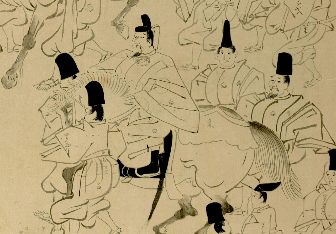 Fujiwara no Korechika (ici représente à cheval) était le rival politique de son oncle Michinaga. Dessin tiré de l’« Histoire des origines du temple Ishiyama-dera » (Ishiyama-dera engi). (Avec l’aimable autorisation de la Bibliothèque nationale de la Diète)