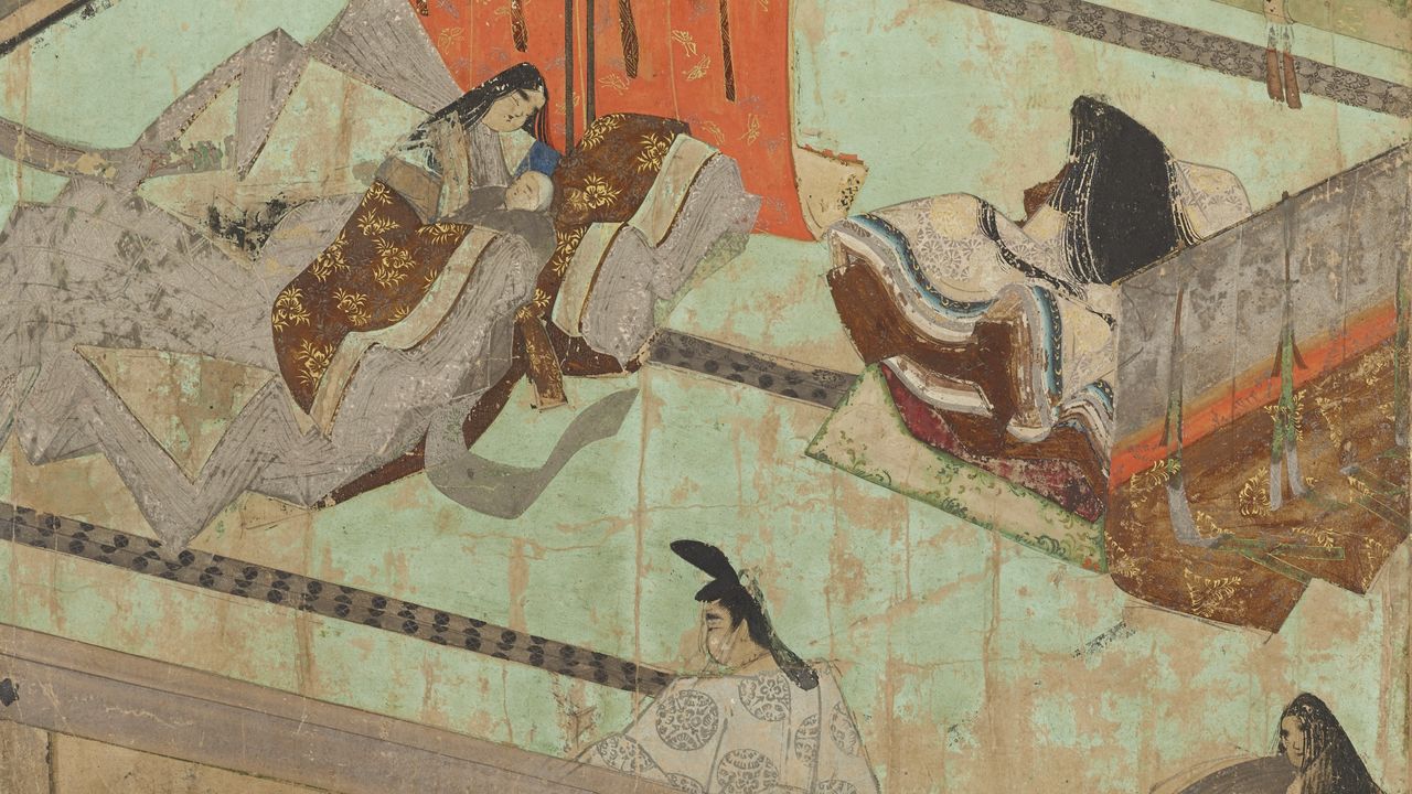 (Photo de titre : fragment du « Rouleau illustré du journal de Murasaki Shikibu » [Murasaki Shikibu nikki emaki]. Rinshi [l’épouse de Michinaga, ici en haut à gauche] tient dans ses bras son petit- fils, le futur empereur Go-Ichijô. Shôshi, mère de l’enfant et fille de Rinshi se trouve en haut à droite. Au premier plan au milieu on aperçoit Michinaga et en bas à droite on reconnaît Murasaki Shikibu. Avec l’aimable autorisation de ColBase.)