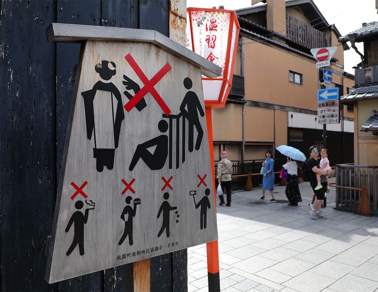 Un panneau dans la rue Hanamikoji du quartier de Gion destiné à attirer l’attention des touristes sur les règles de bonne conduite dans la rue à Kyoto. (Jiji)