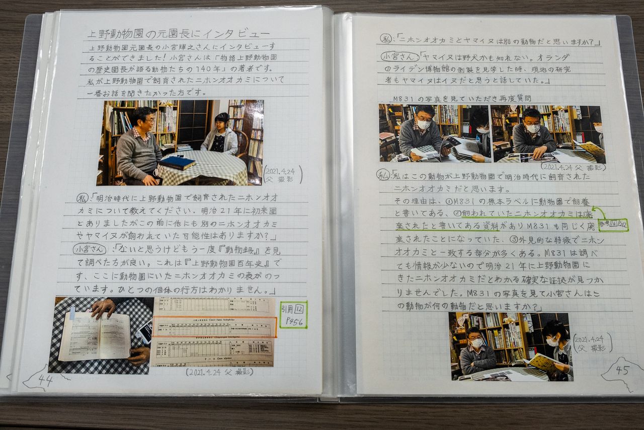 Impressionnés par le rapport de la fillette, les deux experts Kawada et Kobayashi lui proposent de s’associer pour publier un article scientifique basé sur ses découvertes. Pendant deux ans, ils parcourent tous les trois des kyrielles de documents sur les loups japonais, chacun pouvant peut-être contenir une information permettant d’en savoir plus sur le fameux spécimen. Après s’être mis d’accord sur un format et avoir soumis l’article à un examen, le moment tant attendu arrive ; l’article est publié en février 2024 dans le bulletin du Musée national de la nature et des sciences, avec Komori Hinako, aujourd’hui en première année de lycée, en tant qu’auteure principale.