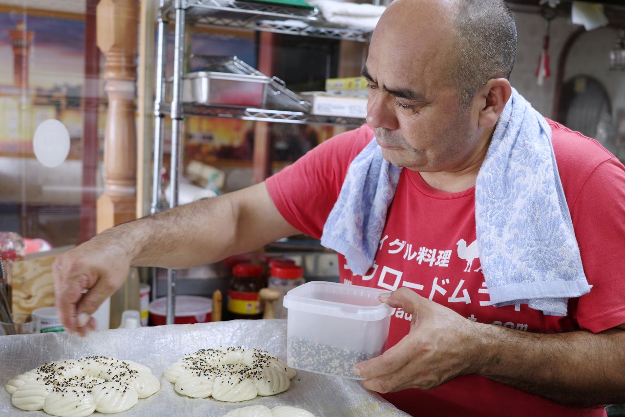 Eli Huxur met la dernière touche au naan ouïghour avant de le faire cuire.