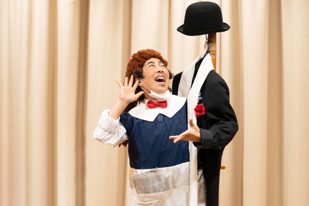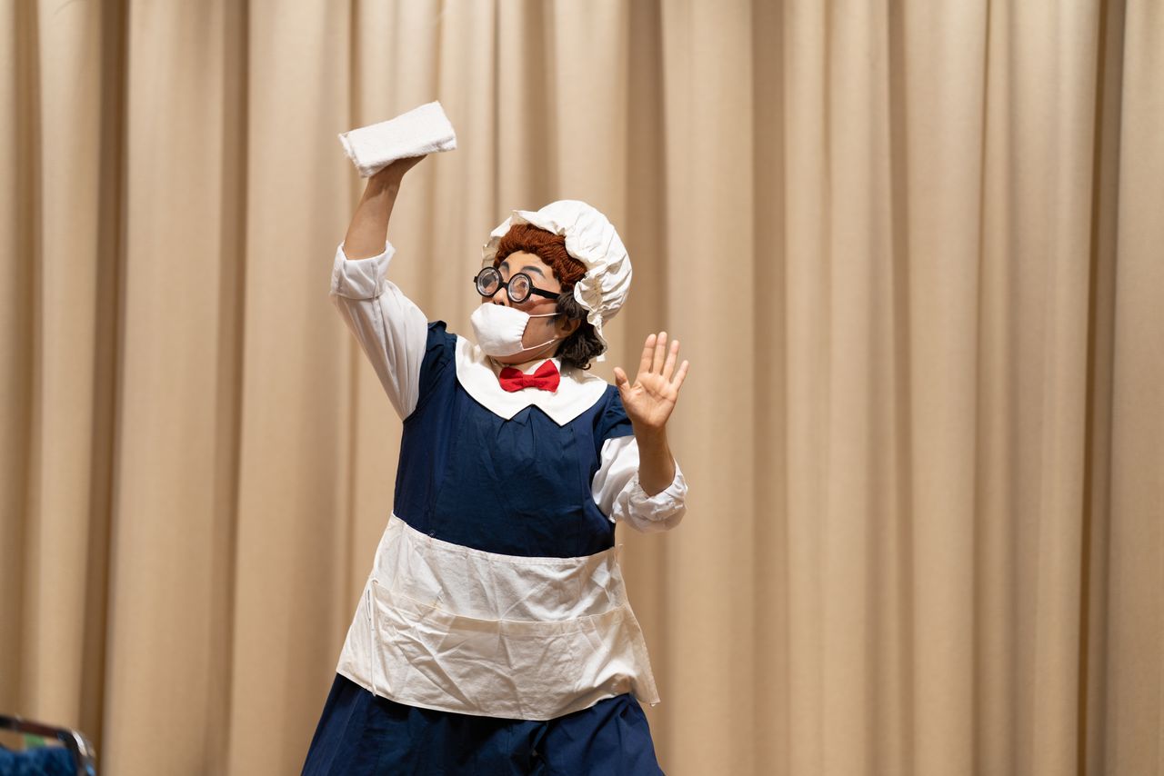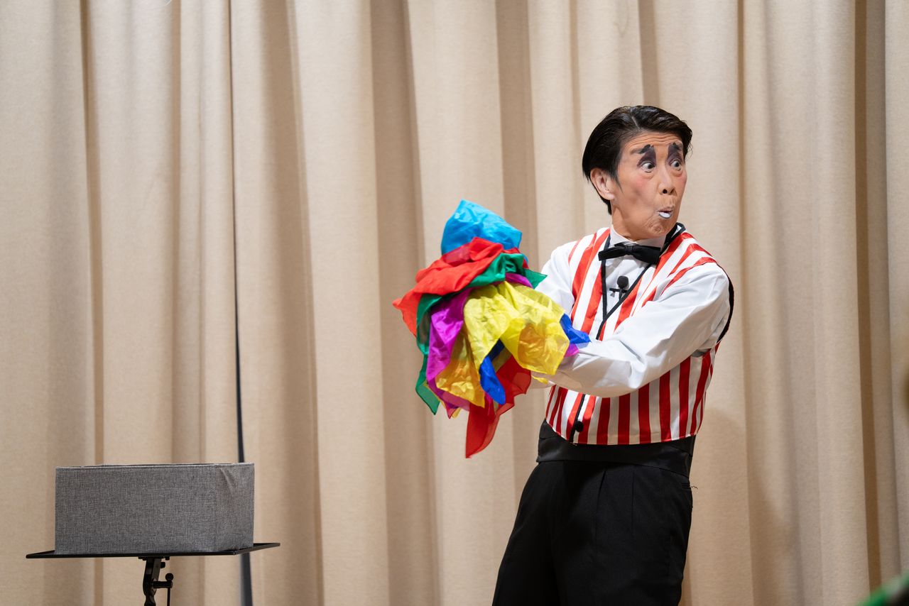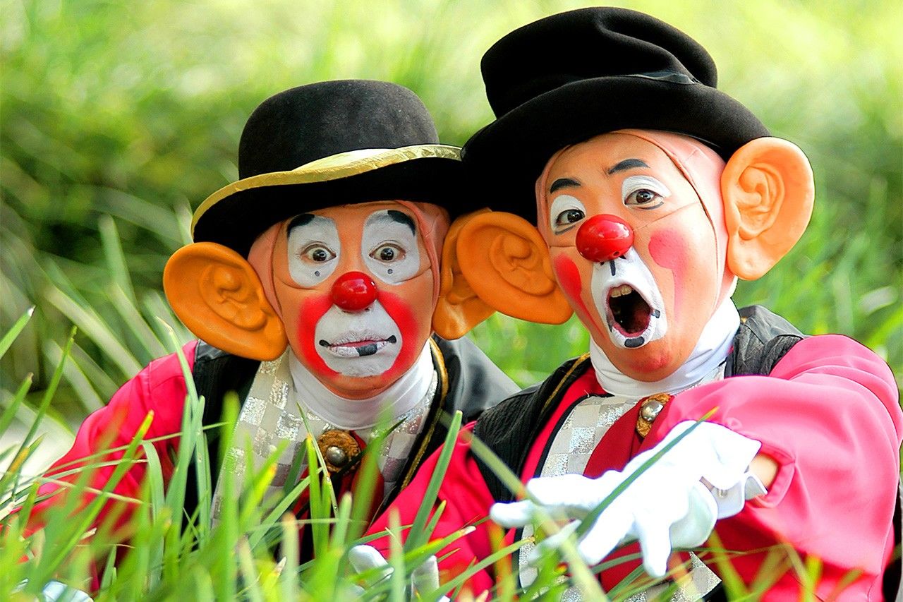 Le spectacle est joyeux, plein de gags, de coups de pied au derrière et de chaos, de simples foulards en soie se transforment en bouquet de couleur grâce à d’habiles tours de passe-passe et les spectateurs sont récompensés pour leur participation par des couronnes en ballons.