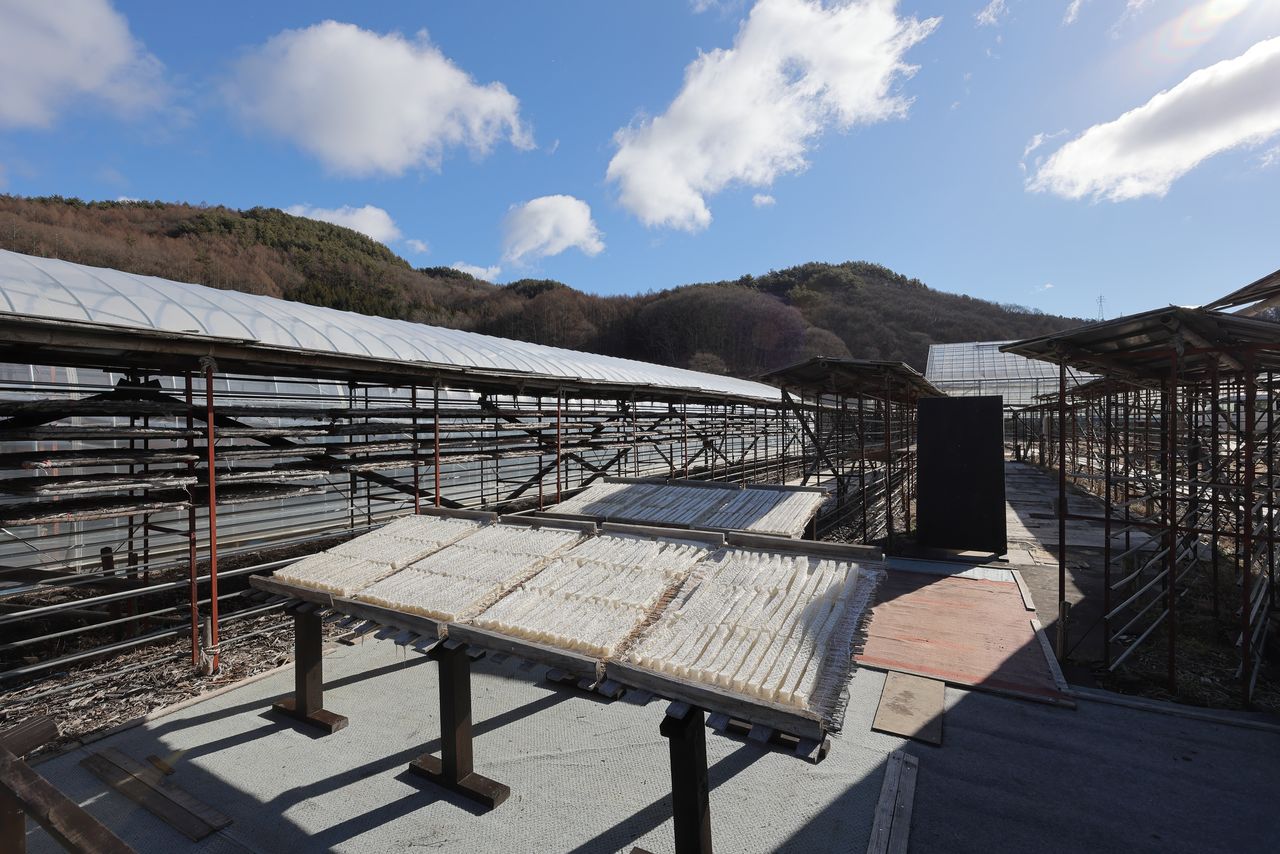 Un local d’assèchement de kanten de l’entreprise Irisen à Nagano. On aperçoit la chaîne de montagnes Tateshina au fond.