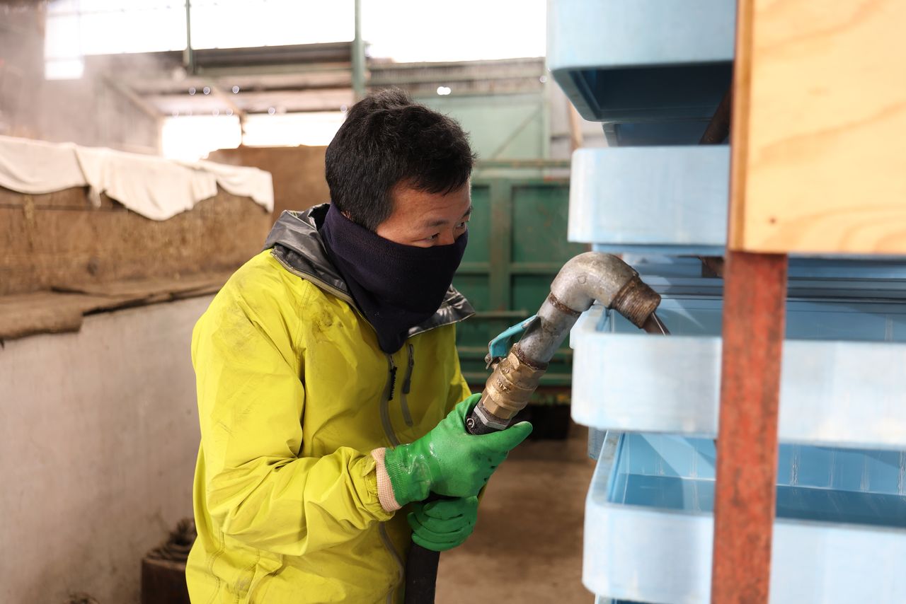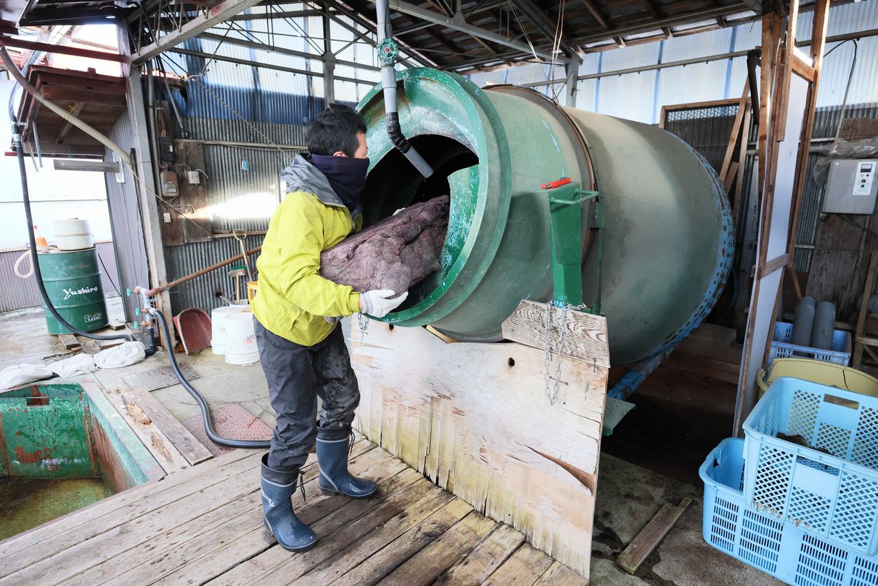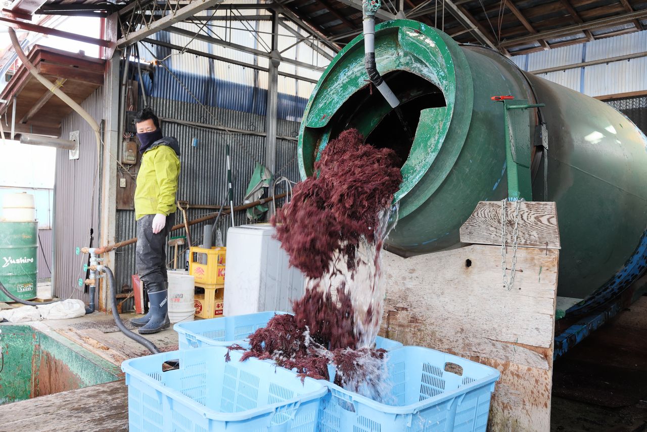 « À l’époque où nous produisions 10 000 bâtonnets de kanten par jour, cela nous prenait trois jours de laver 300 kilos de tengusa » explique Chino. « C’était un dur labeur de transporter tout ça par de grands froids. Cela prend déjà neuf heures de faire bouillir l’eau du chaudron, et puis encore trois heures pour cuire le tengusa, alors on travaillait même la nuit… Et comme il s’agit d’un travail qui tourne jour et nuit, il fallait deux équipes. Ce sont les travailleurs saisonniers venus d’ailleurs qui nous ont soutenu. »