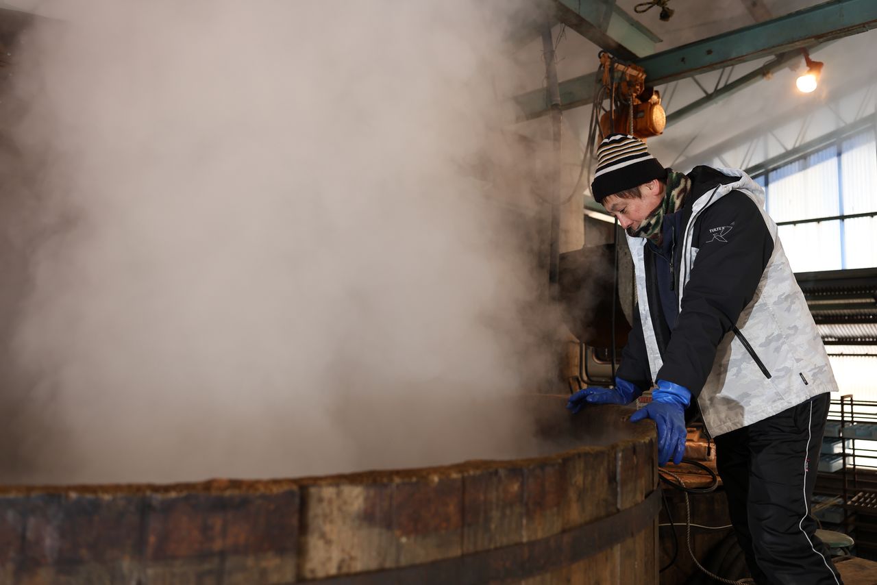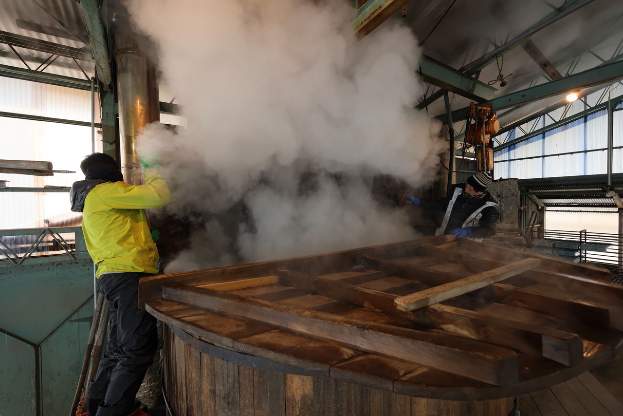 « En été, lorsque le chaudron ne sert pas, le bois se dessèche et les arceaux se desserrent. Avant l’hiver, nous rajoutons beaucoup d’eau pour que le bois se dilate et qu’on évite les fuites. Comme les propriétés du bois avaient bien été tenues en compte, le chaudron ne s’est jamais cassé en 80 ans » explique Chino Fujinori, de la quatrième génération des présidents d’Irisen.