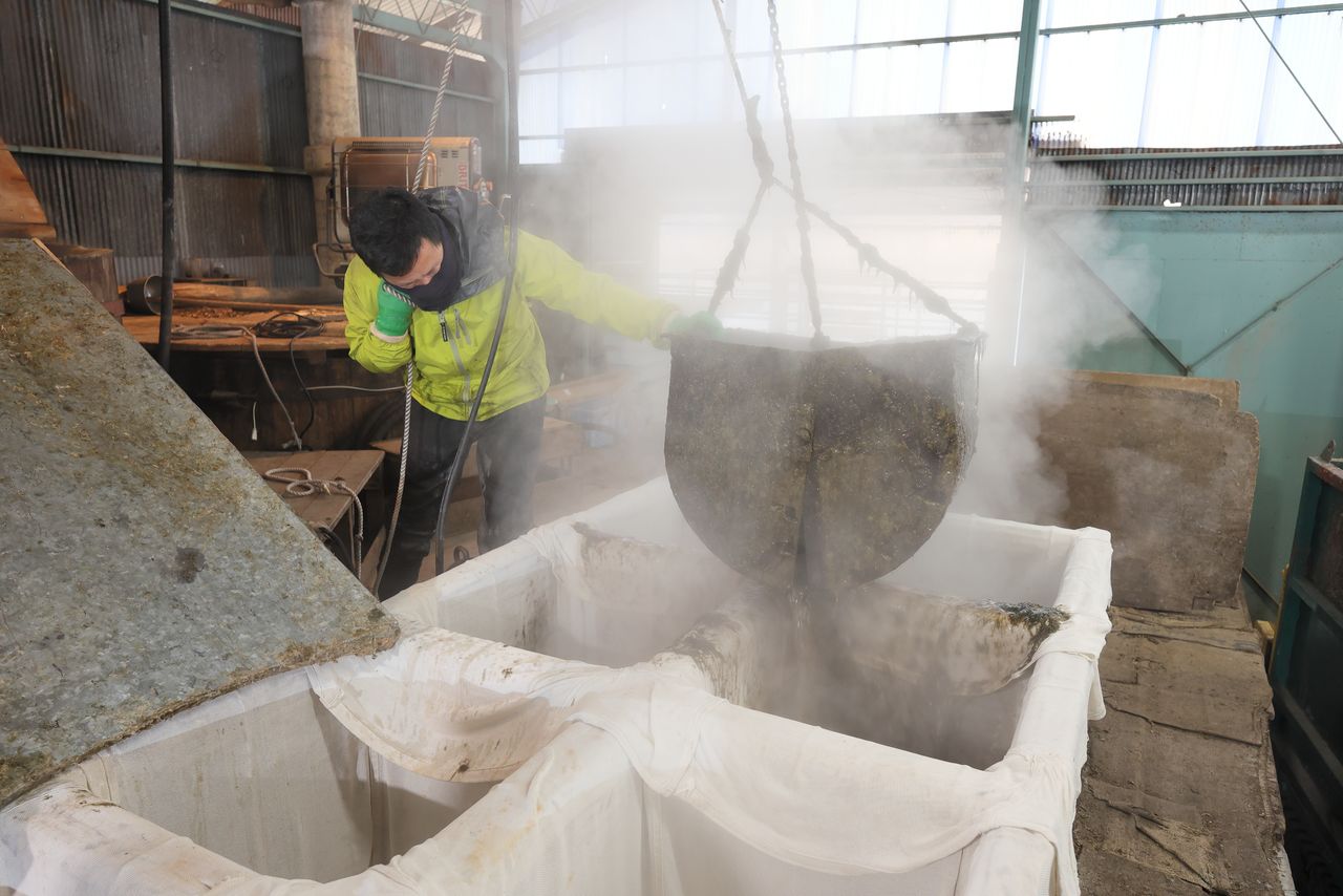 L’extrait de tengusa est l’ingrédient essentiel pour la fabrication du kanten. Le contenu du chaudron est soulevé avec une grue et déposé sur le site de filtration recouvert de toile pour l’égoutter.