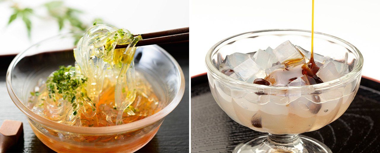 Des nouilles tokoroten et du kanten en dés dans un mitsumame, tous les deux dérivés de l’algue tengusa. (© Pixta)