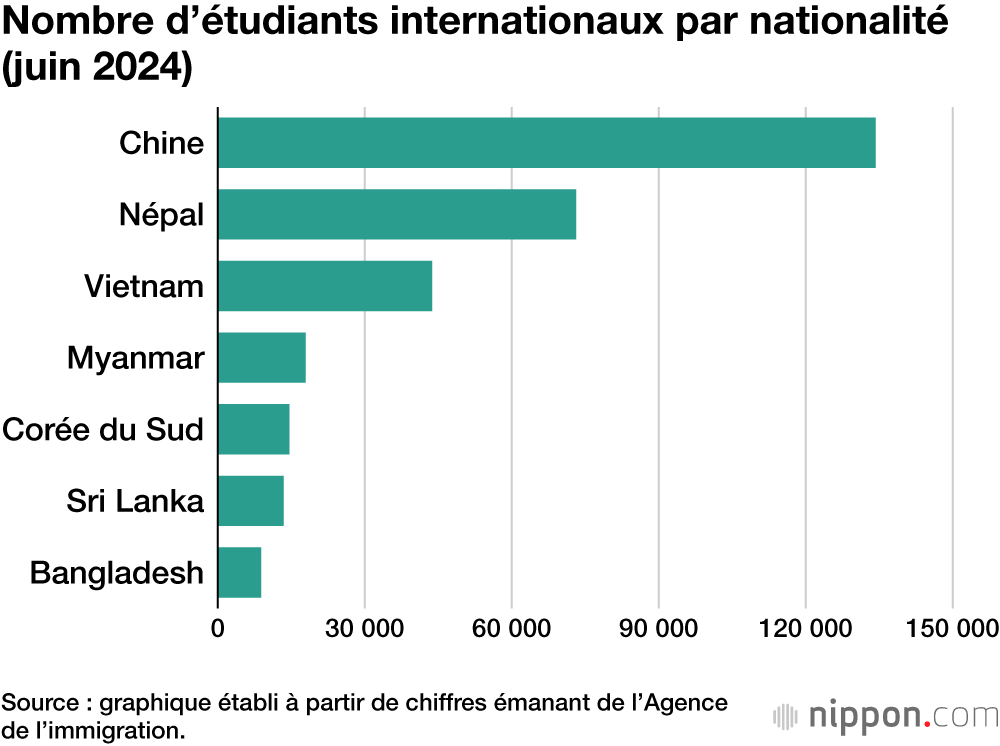 Selon les chiffres de l’Agence de l’immigration, en juin 2024, le Japon accueillait près de 370 000 étudiants étrangers. Ils venaient pour la plupart de Chine (134 239), du Népal (73 136), du Vietnam (43 760), du Myanmar (17 917), de la Corée du Sud (14 610), du Sri Lanka (13 409) et du Bangladesh (8 828).