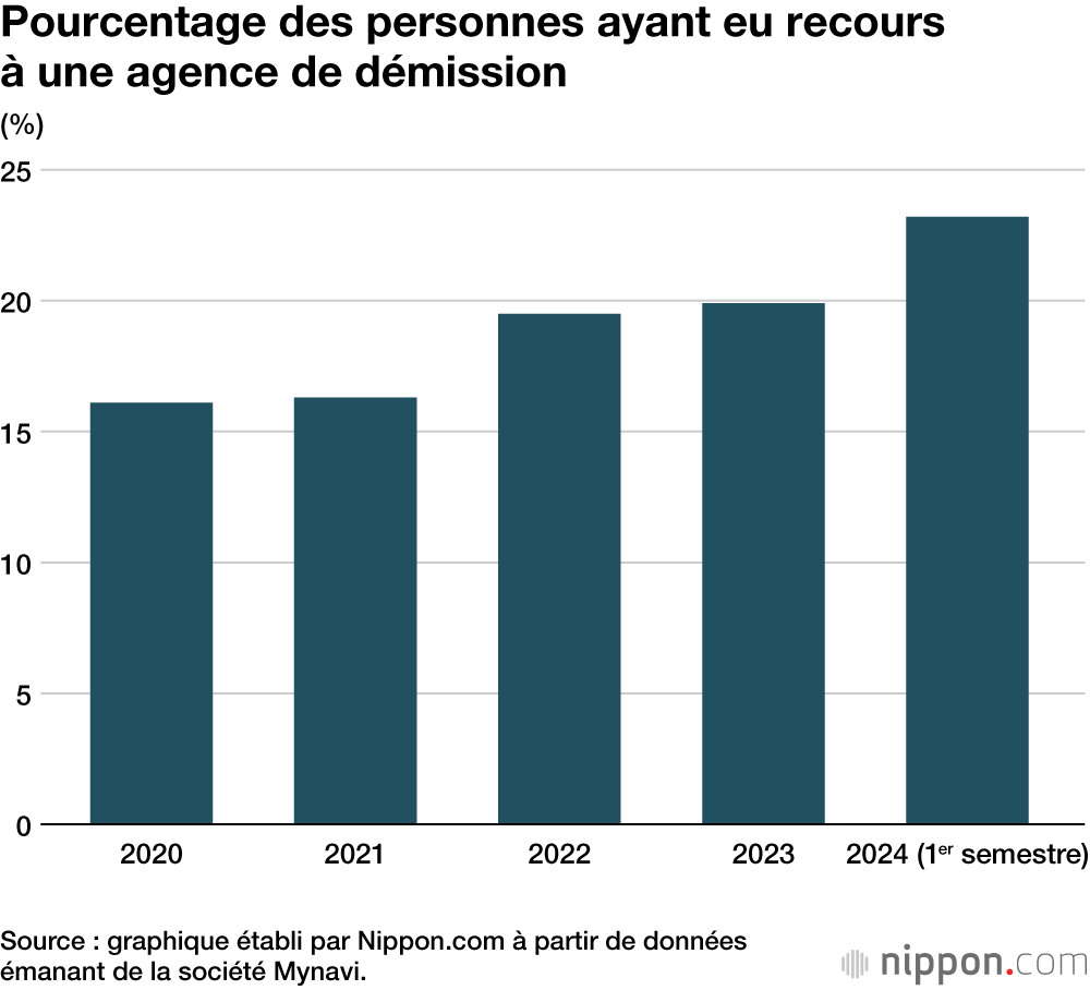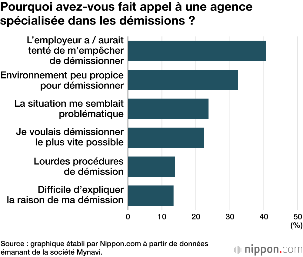 Selon un rapport rendu public en octobre 2024 par Mynavi, une société qui gère une plateforme pour des personnes à la recherche d’un emploi ou qui veulent changer de carrière, sur un échantillon de 800 personnes interrogées (plusieurs réponses étaient possibles), les principales raisons évoquées pour le recours à une agence de démission étaient « Mon employeur a essayé de m’empêcher de démissionner » ou « Ils auraient essayé de m’empêcher de démissionner » (40,7 %), suivi de « Ce n’était pas un environnement où je pouvais dire que je voulais démissionner » (32,4 %). Lors des entretiens menés par l’auteur, cette dernière raison était la plus fréquemment donnée.