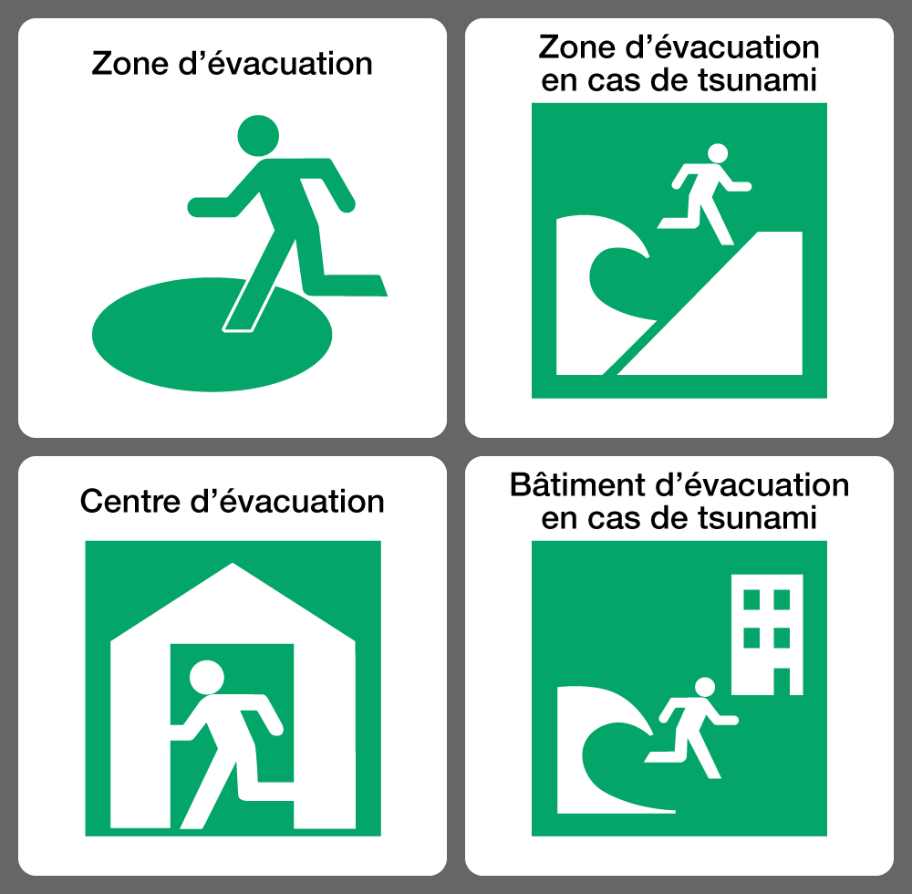 Pictogrammes indiquant différents types de lieux d’évacuation intérieurs et extérieurs. (Pixta)