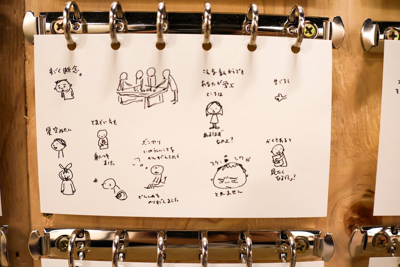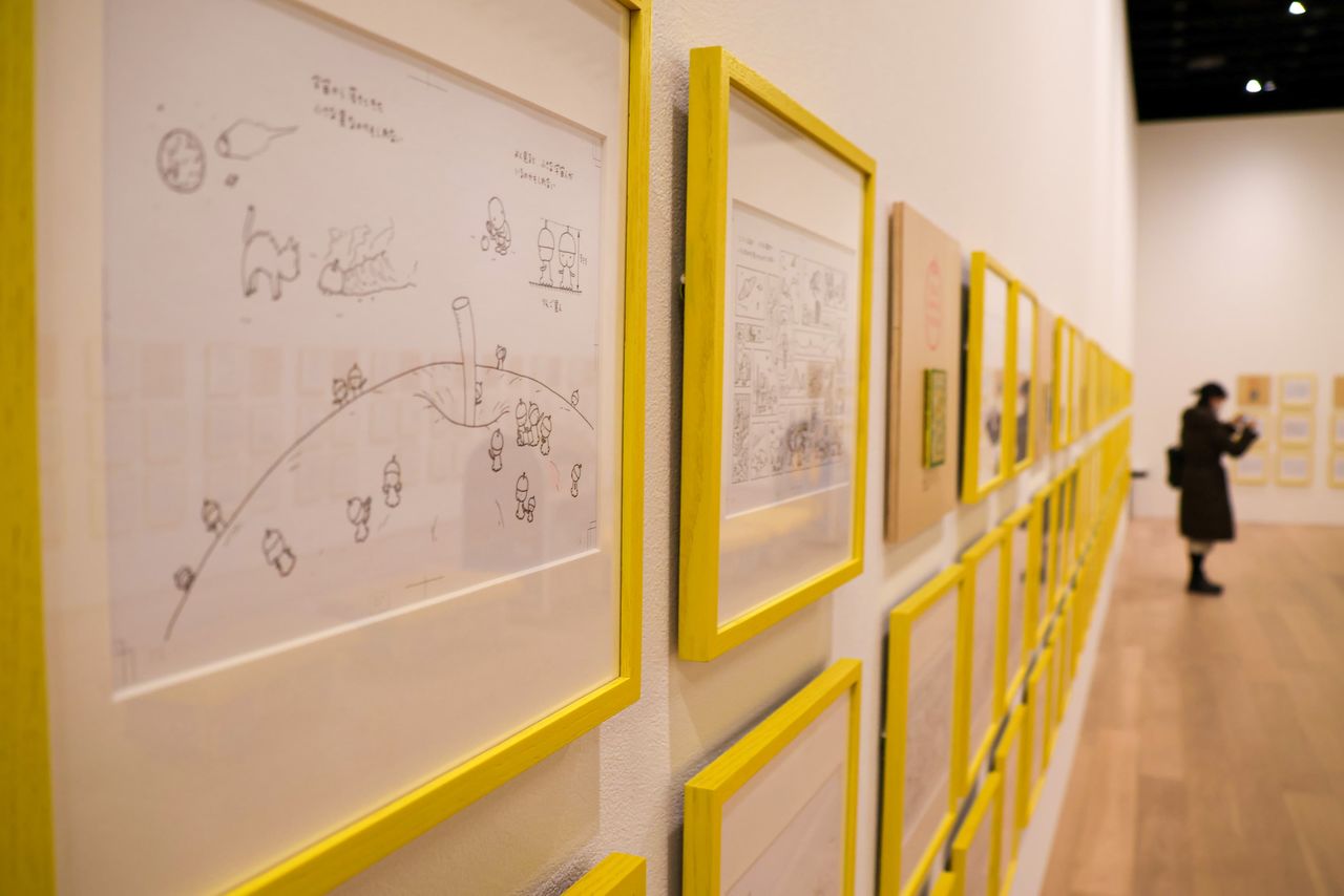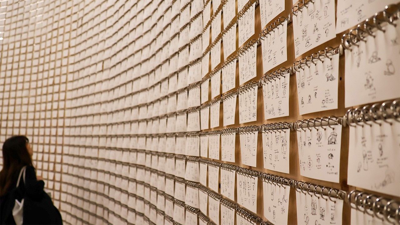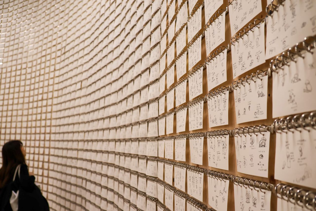 Plus de 7 500 minuscules illustrations remontant au tout début de sa carrière sont accrochés à un immense mur. Jusque-là, l’exposition itinérante ne comprenait que 2 500 illustrations. Le volume a donc triplé. À travers ces scènes de la vie quotidienne, ces paysages, et son propre imaginaire, on voit évoluer la pensée de Yoshitake, et on découvre la source des pépites qui rendent possible ses livres.