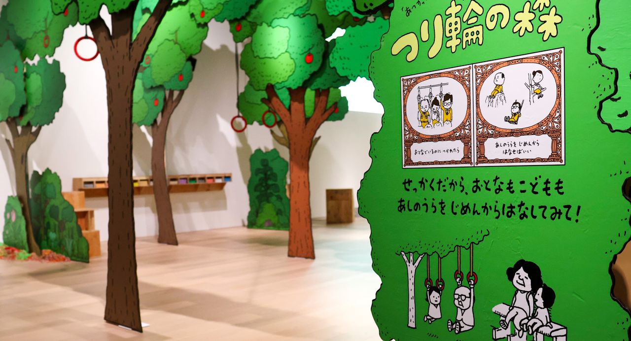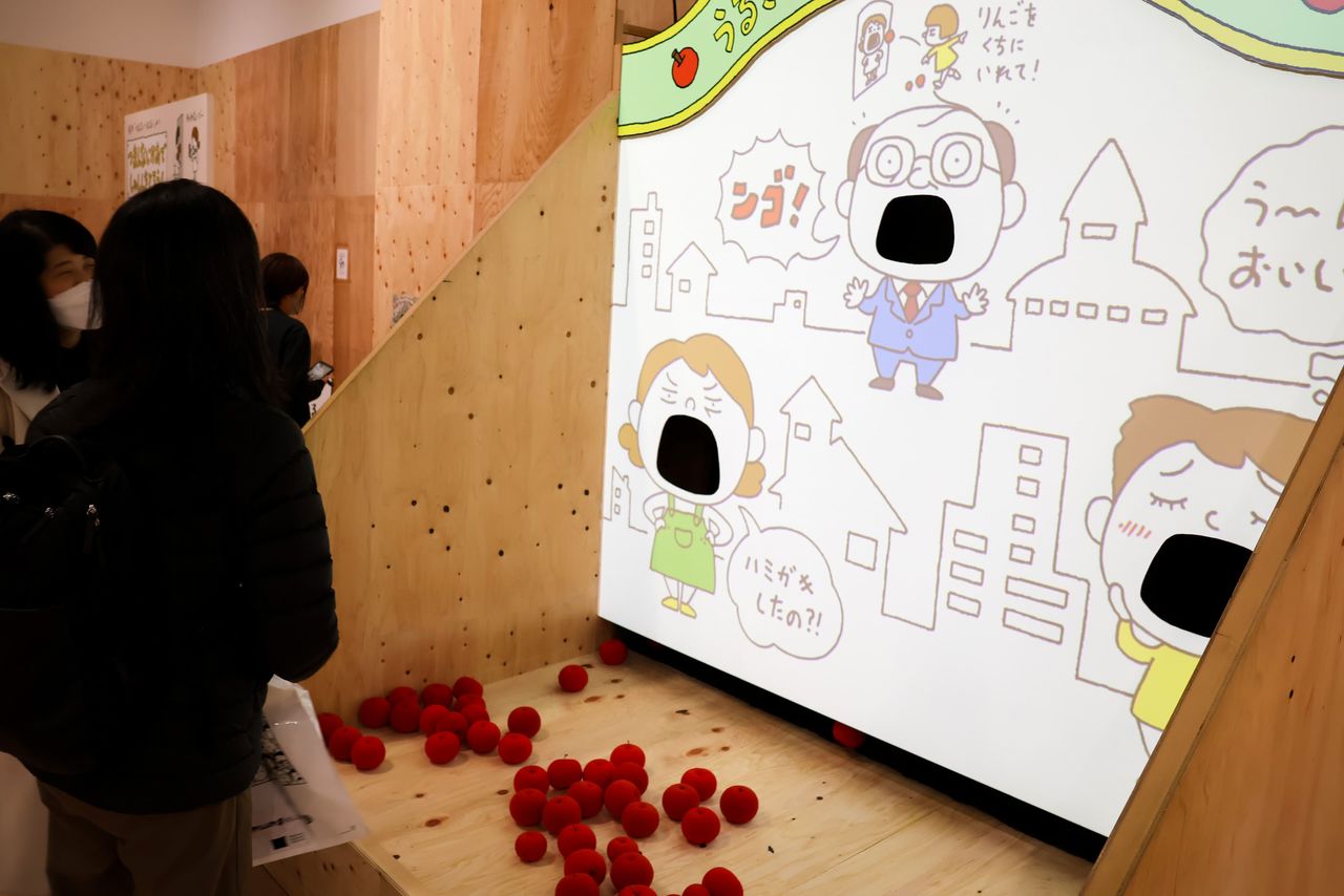 Cette déclinaison de l’expo itinérante propose des expériences immersives comme par exemple la reconstitution de la forêt du livre Atsukattara nugeba ii (« Si tu as chaud, enlève-le »). Des anneaux de gymnastique sont mis à disposition pour reproduire la scène « si tu en as marre d’être un adulte, soulève la plante des pieds du sol ». Il y a aussi des dessins grandeur nature d’adultes en train de gronder des enfants, la bouche grande ouverte, et il est possible de balancer des éponges en forme de pomme dans leurs bouches. Toute l’exposition est très ludique.