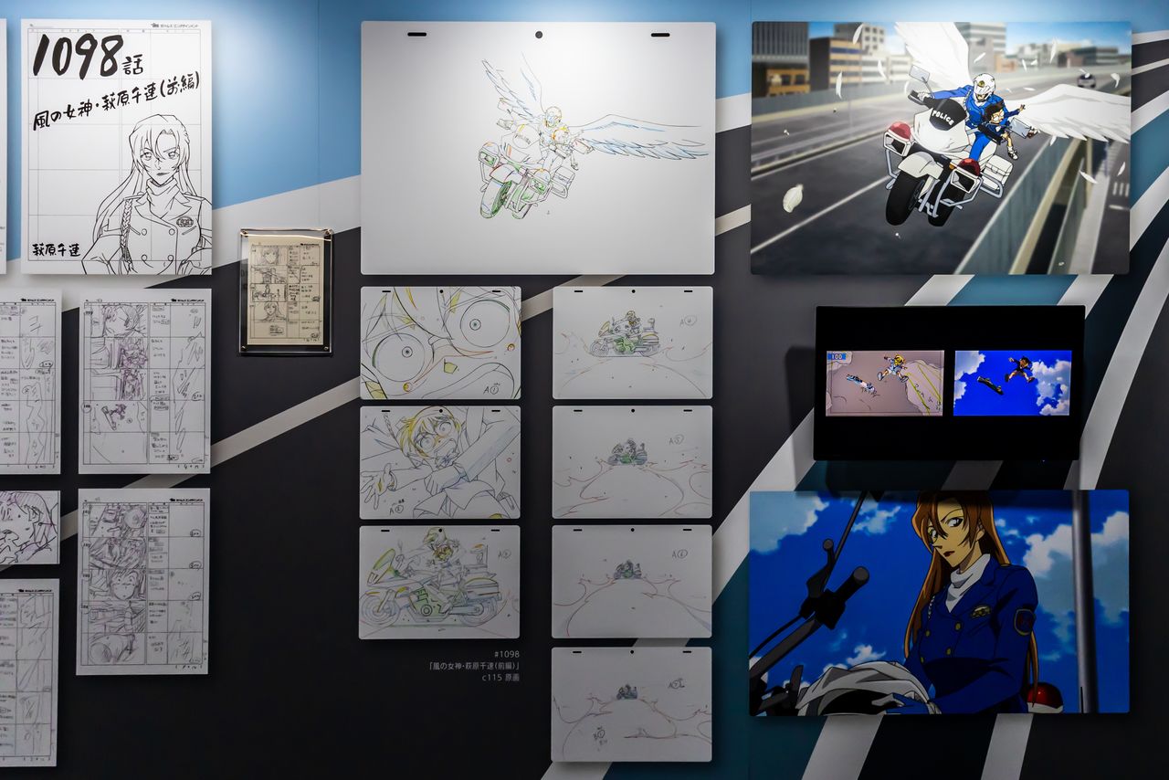 Une multitude de photos de scènes cultes et de storyboards sont exposées côte à côte. (© Aoyama Goshô/Shôgakukan/Yomiuri TV/TMS 1996)