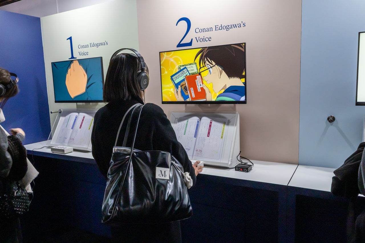 Un espace propose de reconnaître à l’écoute les différentes expressions (comme la joie, la colère, la tristesse et le plaisir), à travers le jeu des comédiens de doublage. Une expérience qui permet de mesurer toute l’étendue de leur virtuosité. (© Aoyama Goshô/Shôgakukan/Yomiuri TV/TMS 1996)