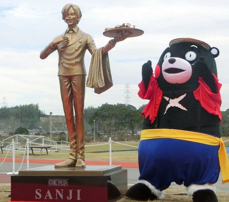 La statue taille réelle de Sanji, l’un des personnages phares du manga One piece, a été dévoilée au public le 7 décembre dans la ville de Mashiki, dans la préfecture de Kumamoto, au sud-ouest du Japon. C’est la municipalité qui a été la plus lourdement endommagée par la série de séismes ayant eu lieu du 14 au 16 avril 2016, et selon son maire, la statue a pour objectif d’apporter espoir et courage à leurs habitants. Sanji étant un cuisinier hors pair dans la série, son personnage a été choisi car de nombreuses écoles de Mashiki durement touchées n’ont pu fournir qu’une quantité très limitée de denrées (pain, lait, maigres bentô…) aux victimes du désastre.